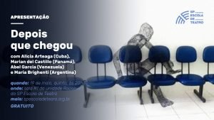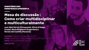 O Ministério Sem Fronteiras apresenta a Mesa de Discussão : Como criar multidisciplinar e multiculturalmente, com entrada gratuita, aberta ao público e transmissão ao vivo no YouTube da escola, no dia 16 de maio, segunda-feira, às 19h30, na sala R1 da Unidade Roosevelt da SP Escola de Teatro. Participam Abel Garcia (Venezuela), Alicia Arteaga (Cuba), Maria Brighenti (Argentina) e Marian del Castillo (Panamá), com mediação do jornalista e coordenador de Extensão Cultural e Projetos Especiais Miguel Arcanjo Prado. Os artistas consideram a criação multidisciplinar e multicultural de enorme valor para a riqueza de uma obra e propõem a partir de suas experiências gerar uma discussão sobre como sobrevivem as artes cênicas em seus diferentes países e no Brasil, como artistas imigrantes. E qual é a riqueza que potencializam nessa sinergia.