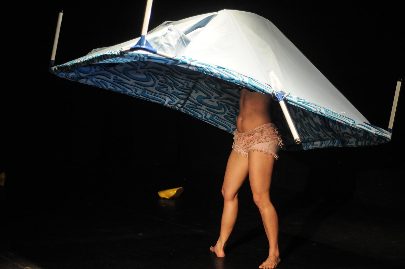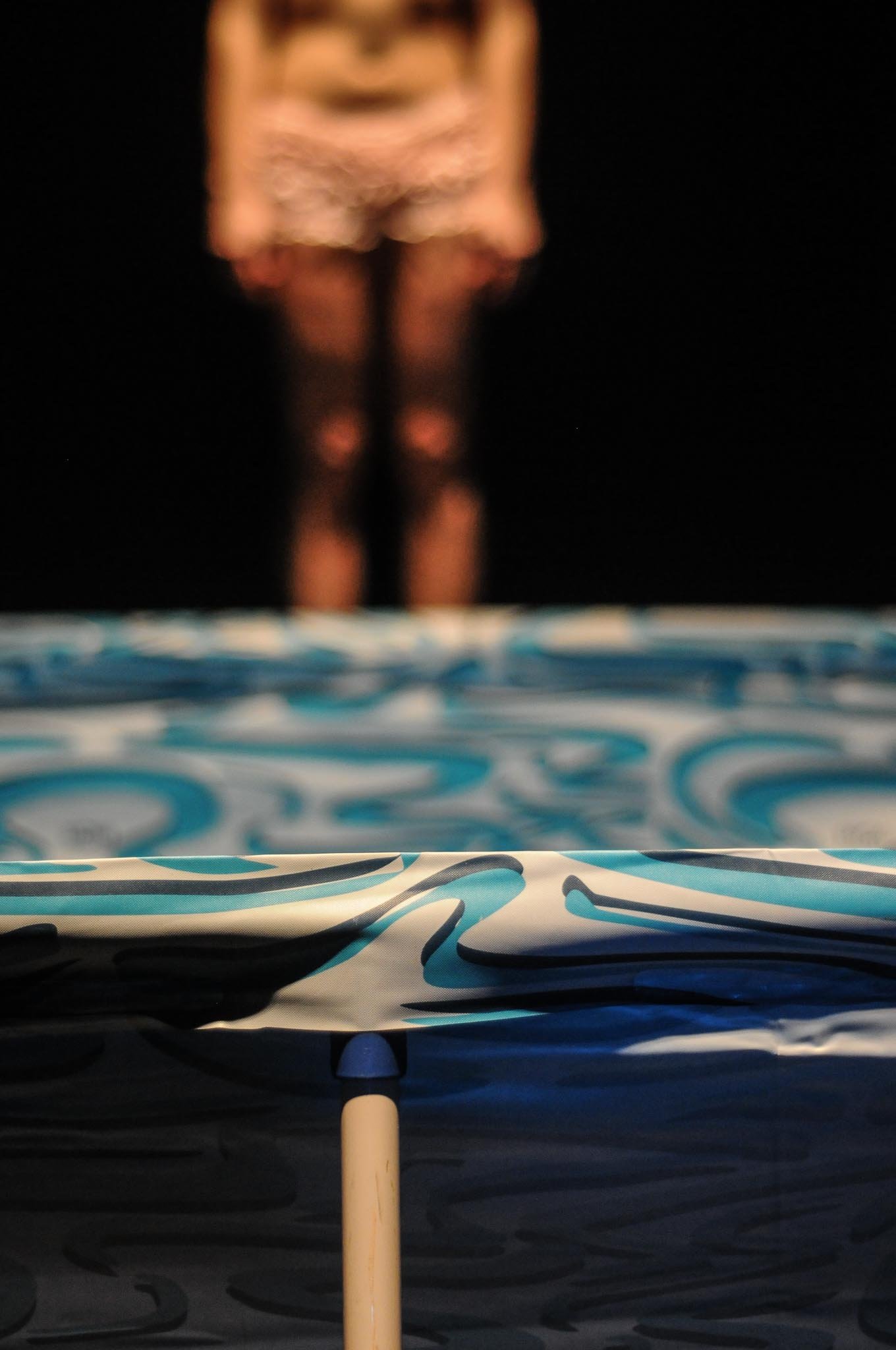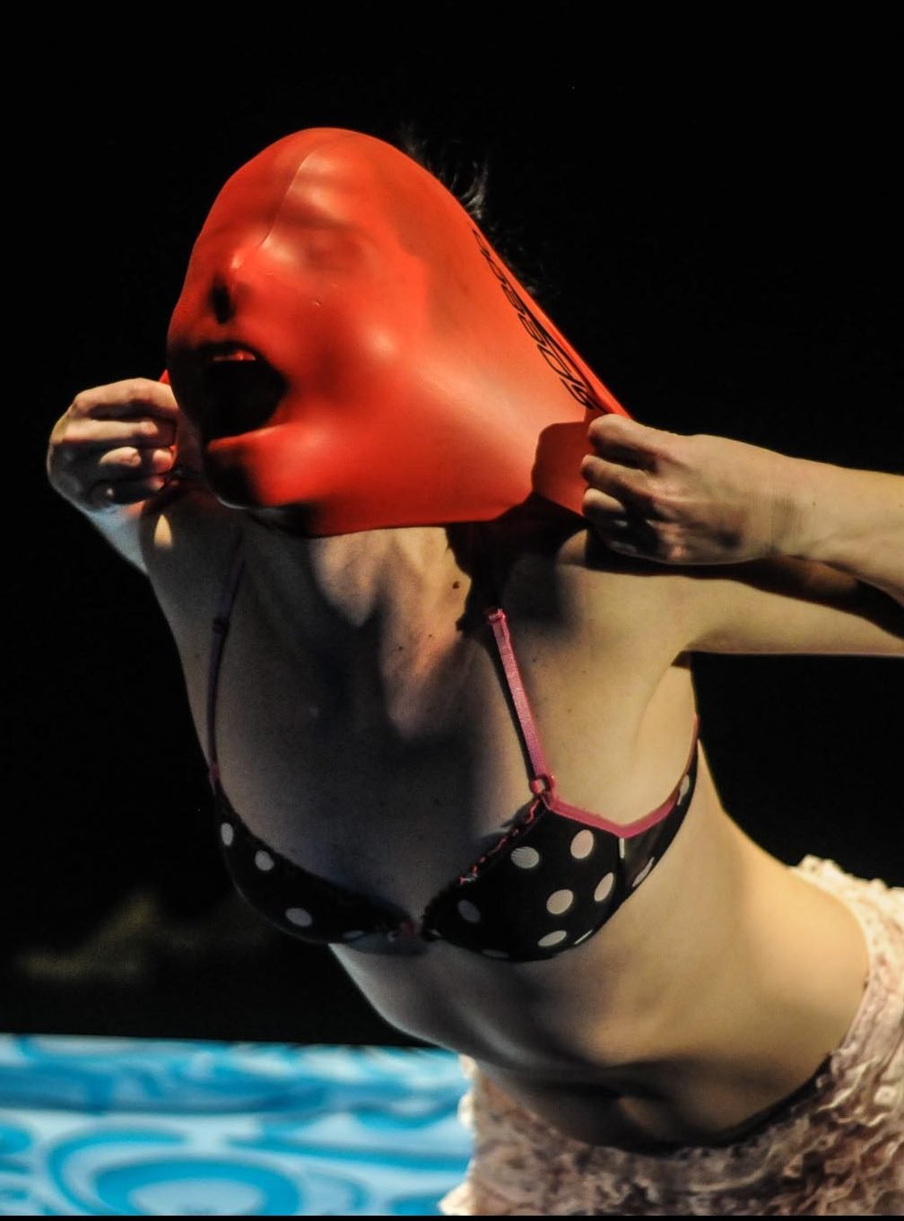 A investigação se vale de uma piscina portátil como objeto alegórico para trazer à tona grande parte das reflexões formuladas por Zygmunt Bauman e o seu conceito de mundo líquido – que denuncia, entre outras coisas, as fragilidades das relações humanas. O trabalho é repleto de imagens tão potentes que, muitas vezes, fazem submergir a palavra utilizada na cena e as palavras com que tento teorizar a experiência vivida e transformada em imagens. A força das imagens, na encenação e nas fotografias, tenta “vencer”, na minha percepção, a função dos textos escritos e falados.