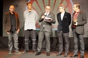 Raul Teixeira, Raul Barretto, Ivam Cabral, Hugo Possolo e Joaquim Gama no palco do 29º Prêmio Shell de São Paulo. Foto: Roberto Ikeda/Miguel Arcanjo Prado