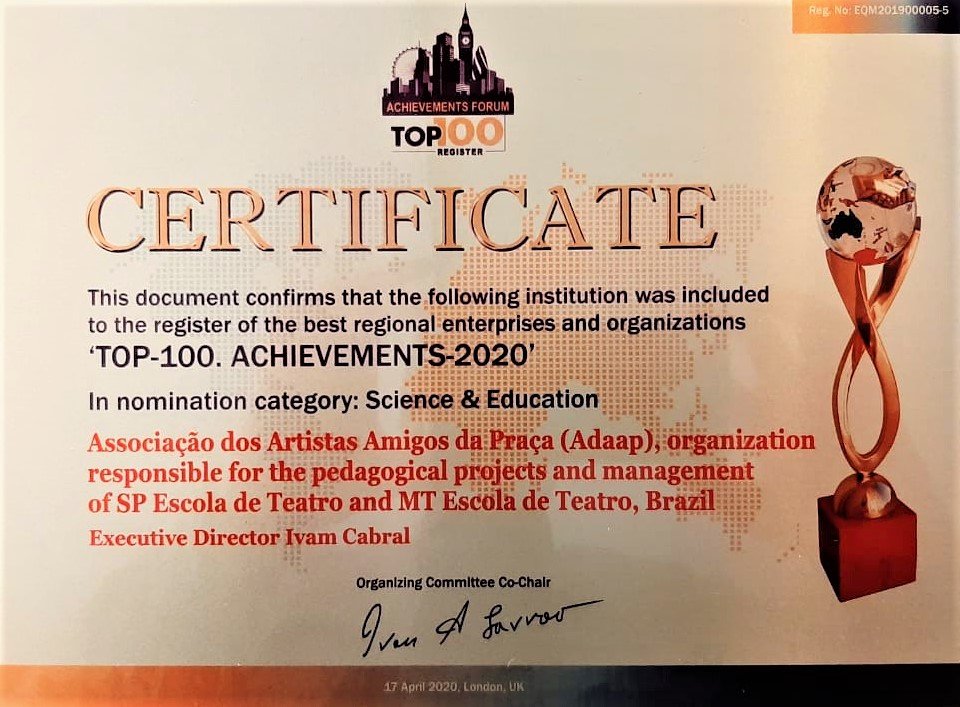 Nestes 10 anos de atuação, o projeto pedagógico e a gestão da SP Escola de Teatro foram reconhecidos, no Brasil e no exterior, pela sua alta qualidade e perfil inovador. Em 2020, a Associação dos Artistas Amigos da Praça (Adaap), que administra o Centro de Formação das Artes do Palco, foi agraciada com o prêmio internacional Top–100 Achievements–2020, na categoria Ciência e Educação. O comitê organizador, sediado em Londres, enviou pelo correio a belíssima placa, confeccionada com madeira e metal, que coroa a láurea.