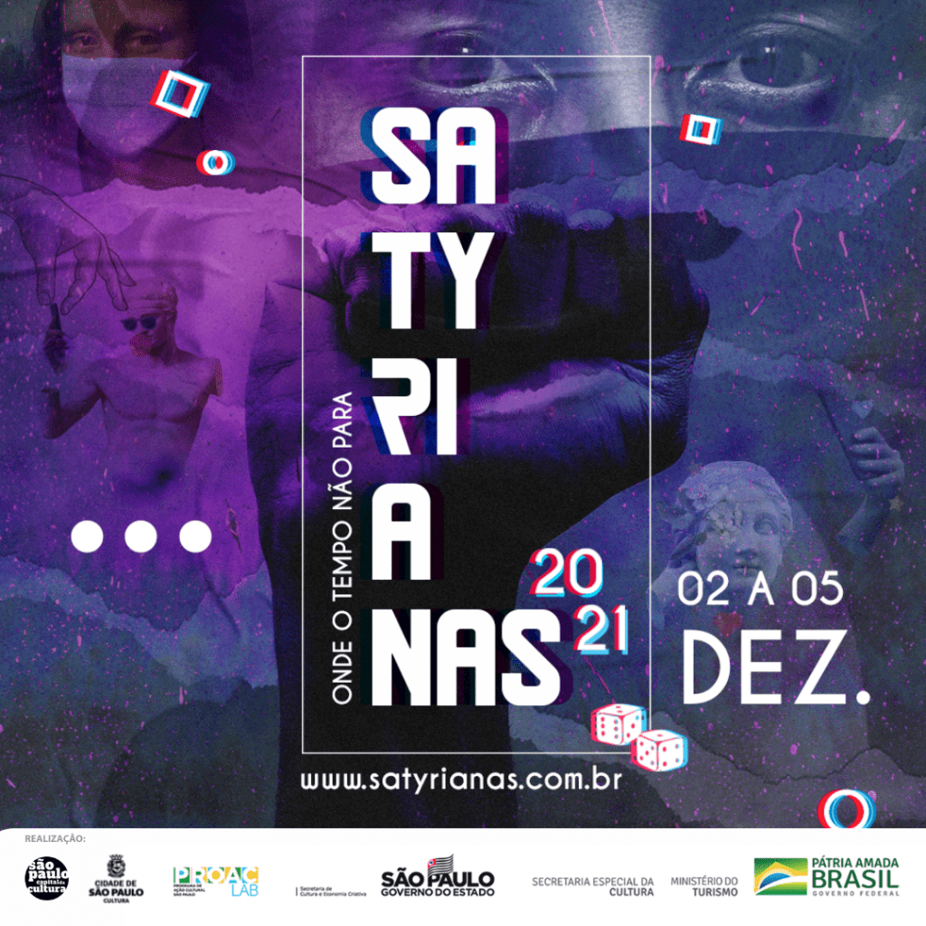 De 2 a 5 de dezembro, a SP Escola de Teatro será palco de parte da programação oferecida pelo Festival Satyrianas 2021, que possui espetáculos gratuitos de teatro, dança, circo, performances, shows, debates e cinema. Em sua 22ª edição, o festival reúne mais de 500 atrações com artistas de diversos lugares do país e de múltiplas áreas. É um dos maiores eventos artísticos do Brasil! O tema deste ano é inspirado na música “O Tempo Não Para”, de Cazuza.