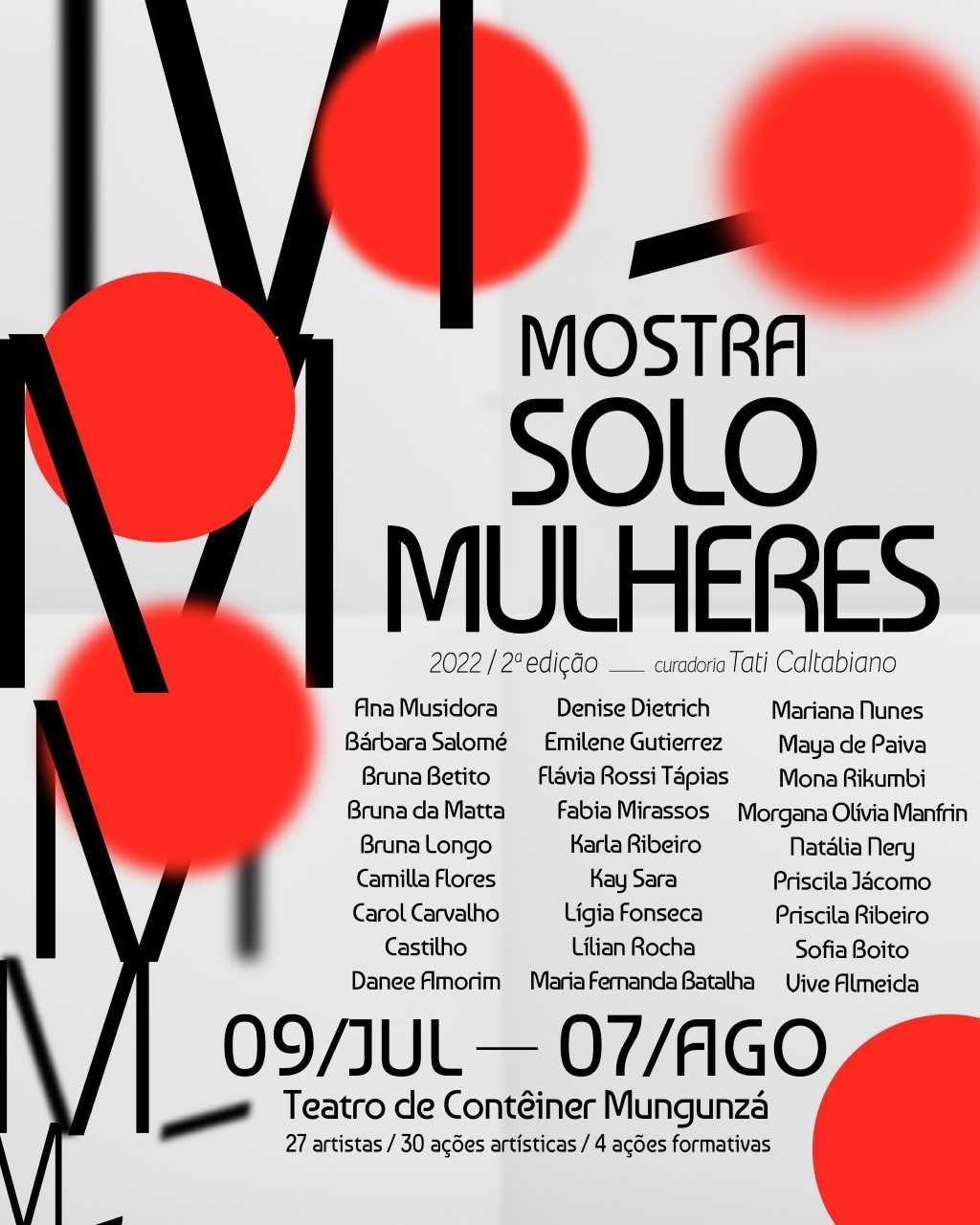 Até o dia 7 de agosto, acontece no Teatro de Contêiner Munguzá a 2ª edição da Mostra Solo Mulheres, evento que reúne mais de 30 atividades artísticas, dentre espetáculos, performances, filmes, videoinstalações, shows, aberturas de processo e oficinas. Na ocasião, 27 artistas mulheres apresentarão espetáculos que abordam múltiplas temáticas, dentre elas, estão as artistas egressas da SP Escola de Teatro: Morgana Olívia Manfrin, Natália Nery e Bárbara Salomé, que também é docente da instituição. Essa edição do projeto busca enaltecer e incentivar a diversidade, dando destaque à trabalhos de mulheres trans, negras, indígenas e deficientes.