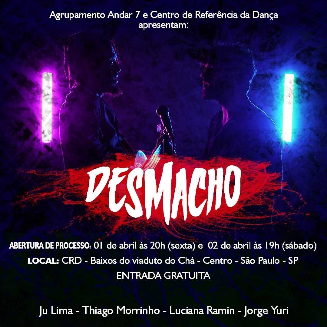 Nesta sexta-feira, 1* de abril, às 20h, e no sábado, 2, às 19h, acontece o trabalho cênico multimídia Desmacho. Nele serão relacionados trechos do livro Cartografias da Masculinidade, com relatos autobiográficos e questionamentos sobre o corpo em nosso contexto atual. A experiência propõe revisitar a naturalização da violência em nossa cultura e evoca uma ritualística para ‘Desmachificar’ os corpos, reconhecer, denunciar e romper os ciclos de violência gerados pelo machismo, questionar os binarismos e expurgar demandas que não pertencem mais a este tempo.