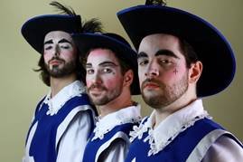 A peça Os Três Mosqueteiros estreia no próximo sábado, 2, no Teatro UOL, às 17h40. Adaptada por Flavio de Souza e Pamela Duncan, que também assina a direção, a montagem é inspirada no famoso clássico de Alexandre Dumas. O enredo narra a história de jovens humildes e ingênuos, mas muito divertidos, que têm o sonho de se tornarem mosqueteiros do reino. Certo dia eles são descobertos pelo braço direito do cruel Roquefor, que os nomeia como mosqueteiros e lhes dá a missão de proteger a princesa e o reino francês, no entanto, tudo não passa de um plano do vilão sequestrar a donzela e tomar conta do reino.