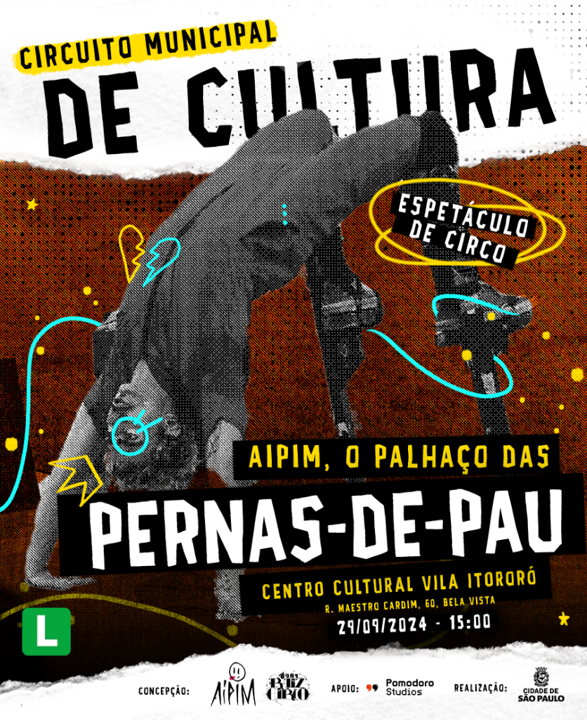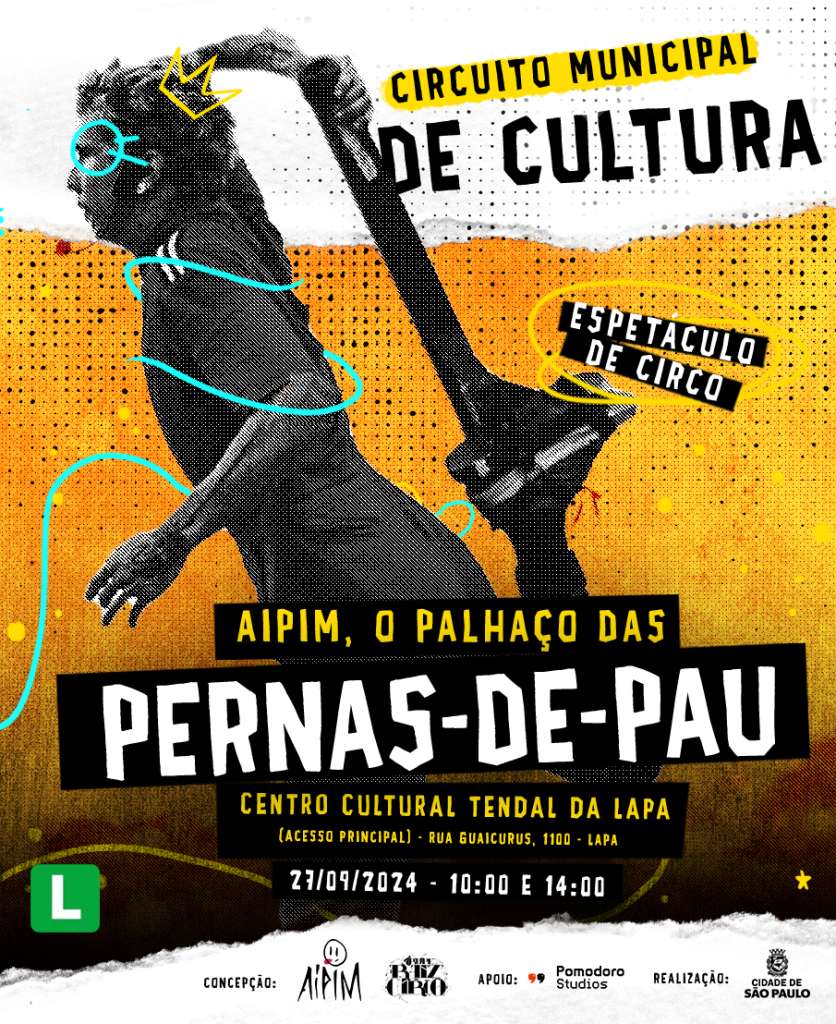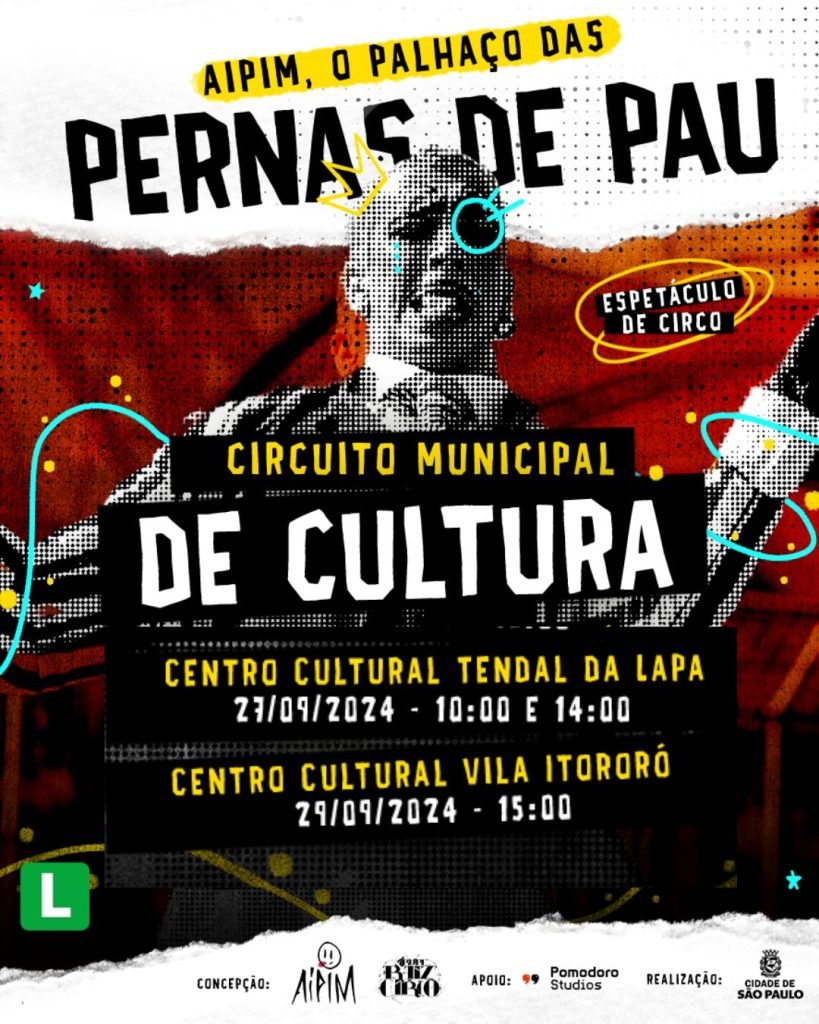 Dentro do Circuito Municipal de Cultura, a peça “Aipim, o palhaço das pernas de pau” faz mais três apresentações nessa sexta-feira (27) e nesse final de semana. As apresentações acontecem na Vila Itororó, na Bela Vista, e no Centro Cultural Tendal da Lapa.