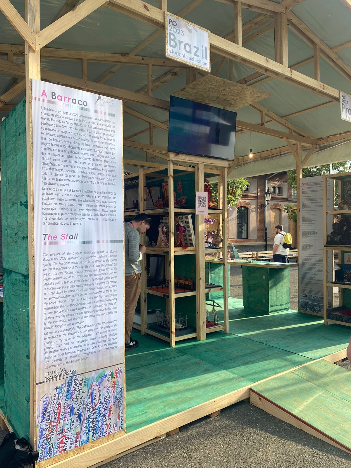 “A Quadrienal de Praga de 2023 lançou à mostra dos estudantes um provocante desafio: o espaço ao ar livre. A Mostra se instalaria nas ruas do Mercado do Antigo Matadouro. Não perdemos o chão, mas perdemos o teto. Sem teto – homeless. A partir daí o ‘genius loci’ do mercado de Praga e o ‘genius loci’ de nossas feiras livres se comunicam, soprando em nossos ouvidos, foi se materializando a ideia de barraca, tenda, abrigo de lona, construção leve. Nosso projeto traduz cenograficamente o conceito ‘barraca’. Regido por simplicidade sem simplificação, tocamos em tradições ancestrais que nos ligam ao teatro. No nascimento do teatro grego, uma barraca sobre uma carroça foram as primeiras construções cenográficas: o rito, o efêmero, a feira, nomadismos & ciganagem, a mambembagem, mascates, circo-teatro, lona, tablado, festa, está tudo ali tecendo complexos & fascinantes trançados culturais. Aberto aos quatro ventos os limites do dentro e do fora, se borram. Receptivo e vulnerável. Labiríntico e múltiplo, A Barraca é metáfora do país. Em diálogo de contraste com a simplicidade da estrutura, os trabalhos dos estudantes, razão da mostra, são valorizadas como joias (raras?). Flutuam em totens transparentes, oferecendo vários pontos de observação, abrindo-se a novas significações. Nosso espaço homenageia o grande cenógrafo brasileiro Santa Rosa e exalta a rica diversidade de manifestações dramáticas, cenográficas e performáticas do povo brasileiro”.