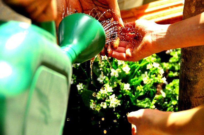 Aprendizes lavam as mãos após plantio de mudas em frente ao prédio da Escola (Foto: Arquivo SP Escola de Teatro)   Como a gente…