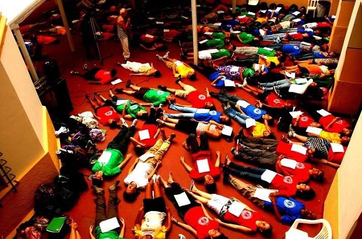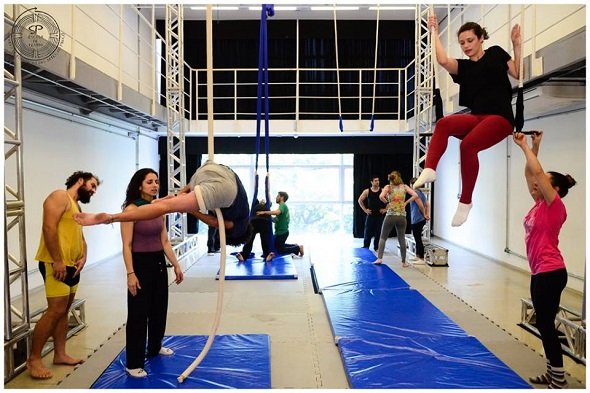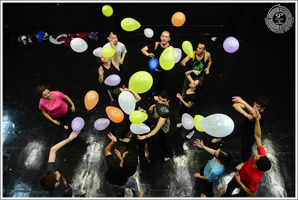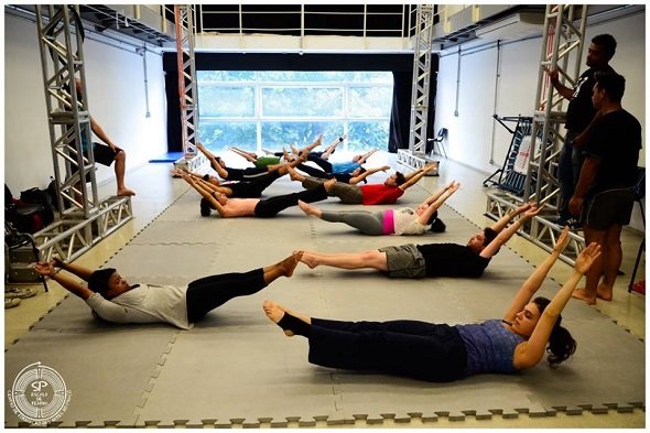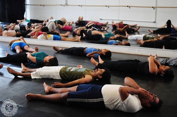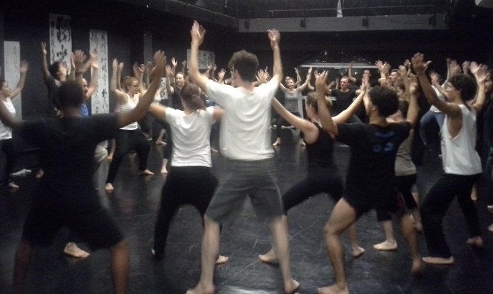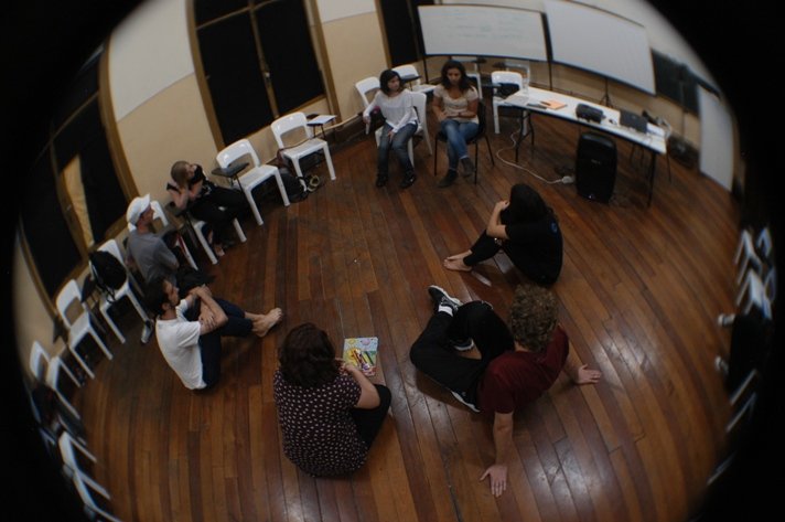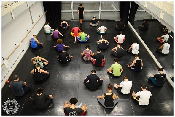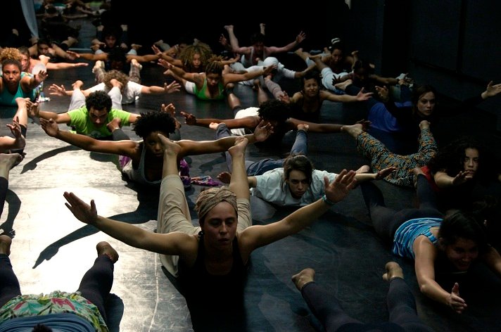 Com roupas de trabalho, pés descalços e os corpos atentos e prontos para o exercício, os aprendizes de Atuação, Humor e Direção da…
