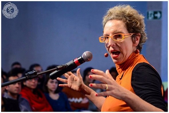 A urbanista Raquel Rolnik durante o encontro com os aprendizes da SP Escola de Teatro   Os aprendizes da SP Escola de Teatro –…