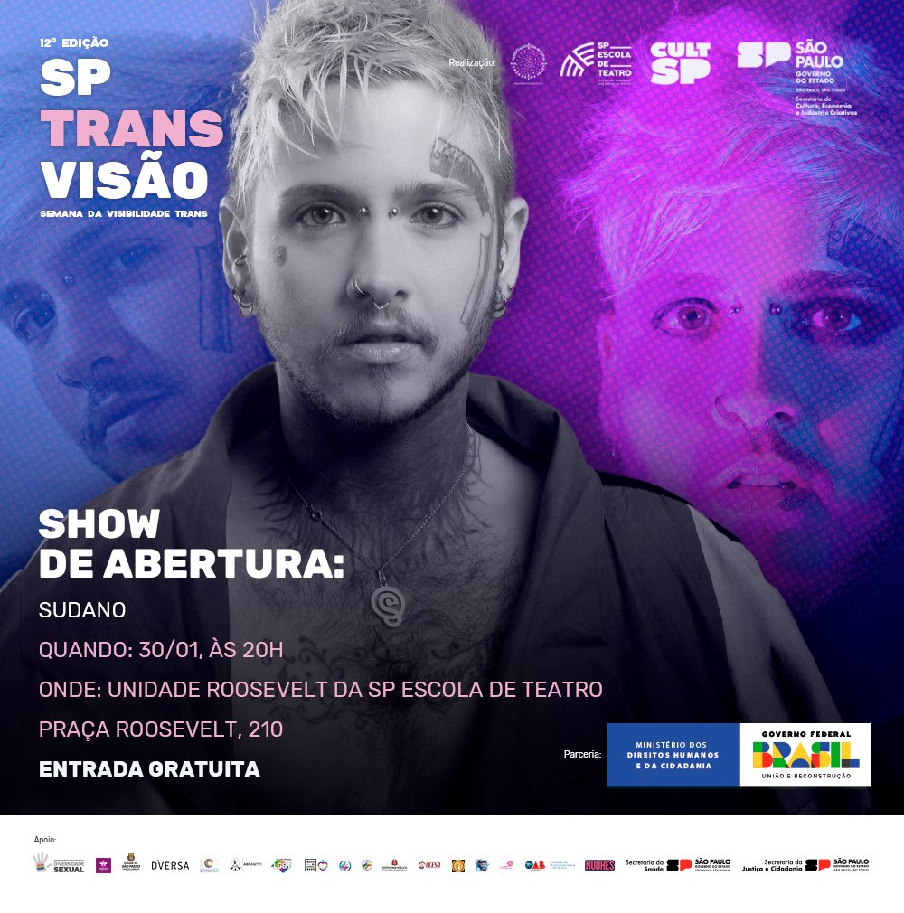 A SP Escola de Teatro, instituição da Secretaria da Cultura, Economia e Indústria Criativas do Estado de São Paulo, gerida pela Associação dos Artistas Amigos da Praça (ADAAP), promove de 30 de janeiro a 2 de fevereiro a 12ª edição do SP Transvisão – Semana da Visibilidade Trans.