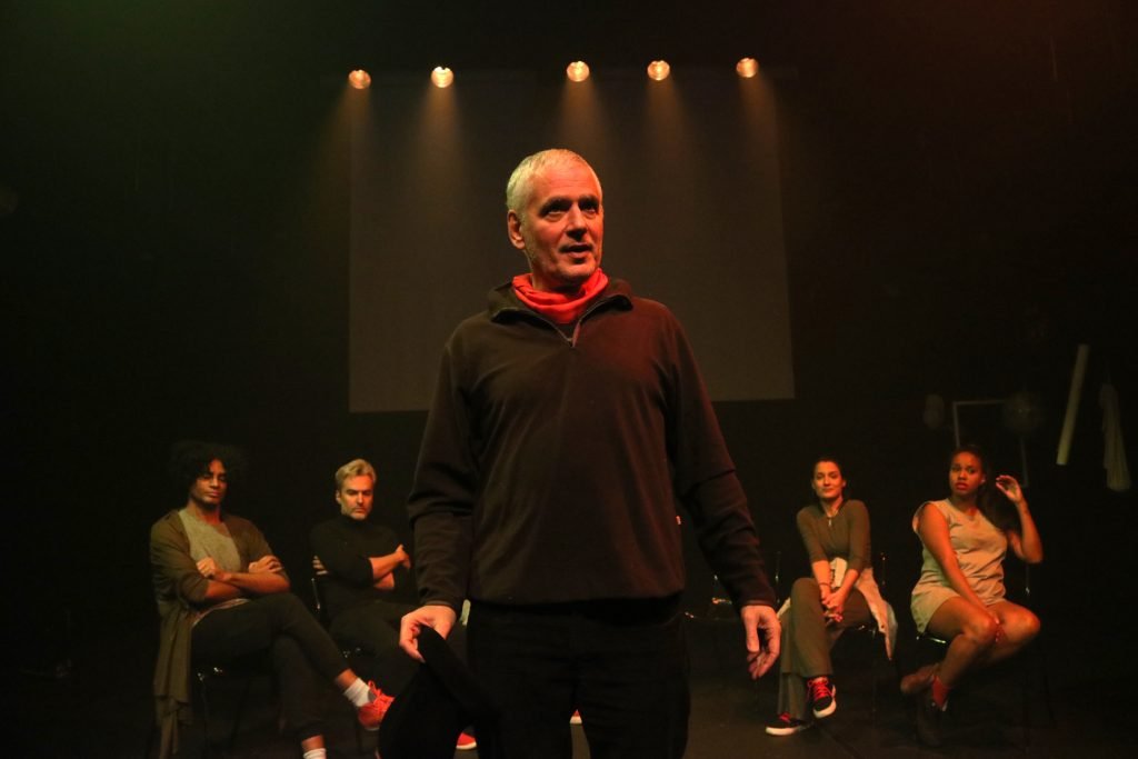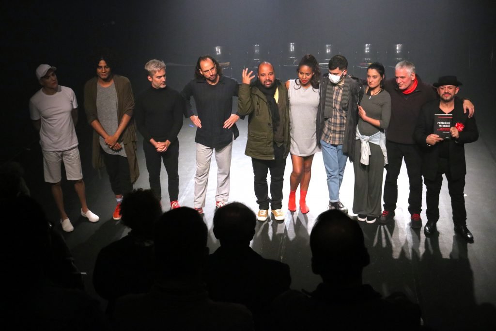Elenco do espetáculo Sapathos com Miguel Arcanjo Prado, coordenador de Extensão Cultural e Projetos Especiais da instituição. Foto: Bruno Galvincio/Adaap