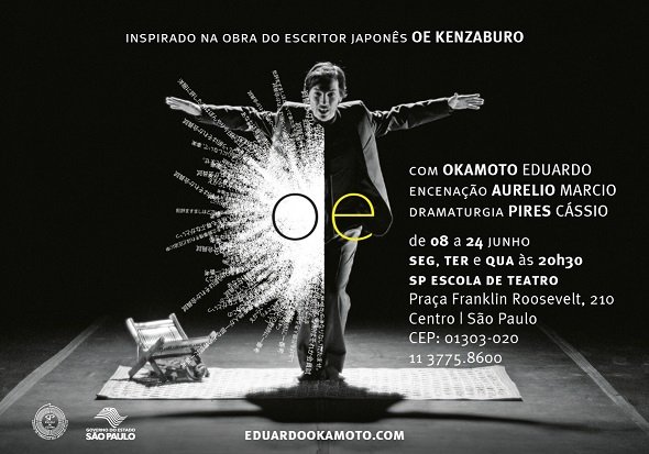 O ator Eduardo Okamoto apresenta, a partir de segunda-feira (08), na SP Escola de Teatro – Centro de Formação das Artes do Palco, seu espetáculo solo “Oe”, inspirado na obra “Jovens de um novo tempo, despertai!”, do escritor japonês Kenzaburo Oe, Prêmio Nobel de Literatura de 1994. Com direção de Marcio Aurelio e dramaturgia de Cássio Pires, a montagem não pretende fazer apenas uma dramatização do livro, mas sim experenciá-la.