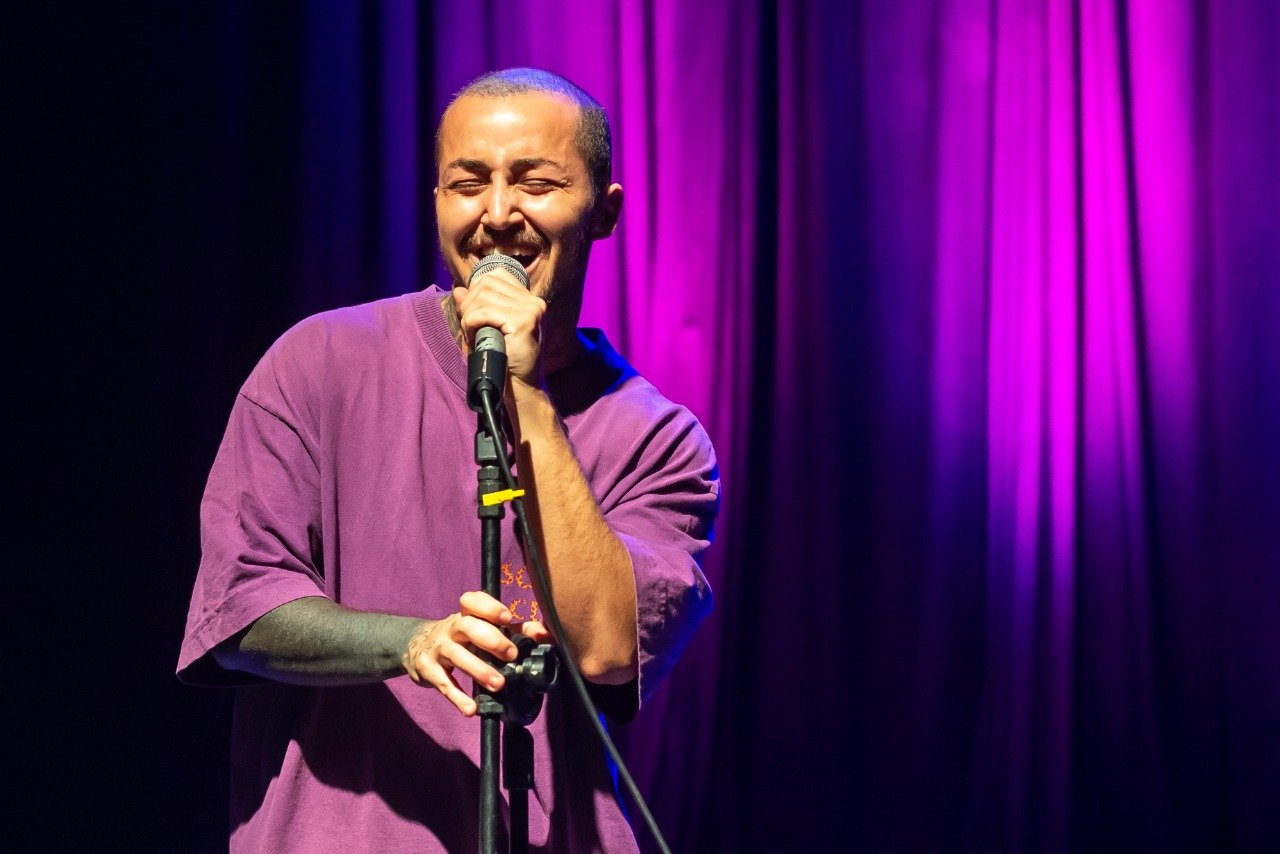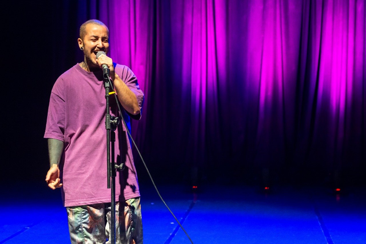 Foram seis excepcionais apresentações que despertaram diversas emoções no público, cada uma à sua maneira. A primeira performance artística foi do ator e cantor trans Kaique Theodoro, com a música autoral ‘Ao Sol’, mesclada com uma poesia cuja temática tece uma crítica e confronta a lógica do sistema atual. “Eu não nasci para caber na tua bolha”, declamou o artista.