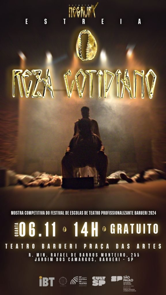 Negrur4, Coletivo de Investigação Teatral forjado na SP Escola de Teatro, composto por artistas-estudantes de sete das linhas de estudo (Atuação, Cenografia e Figurino, Dramaturgia, Humor, Iluminação, Sonoplastia e Técnicas de Palco) e formado inteiramente por pessoas racializadas, apresenta “Reza Cotidiano” no Festival de Barueri.