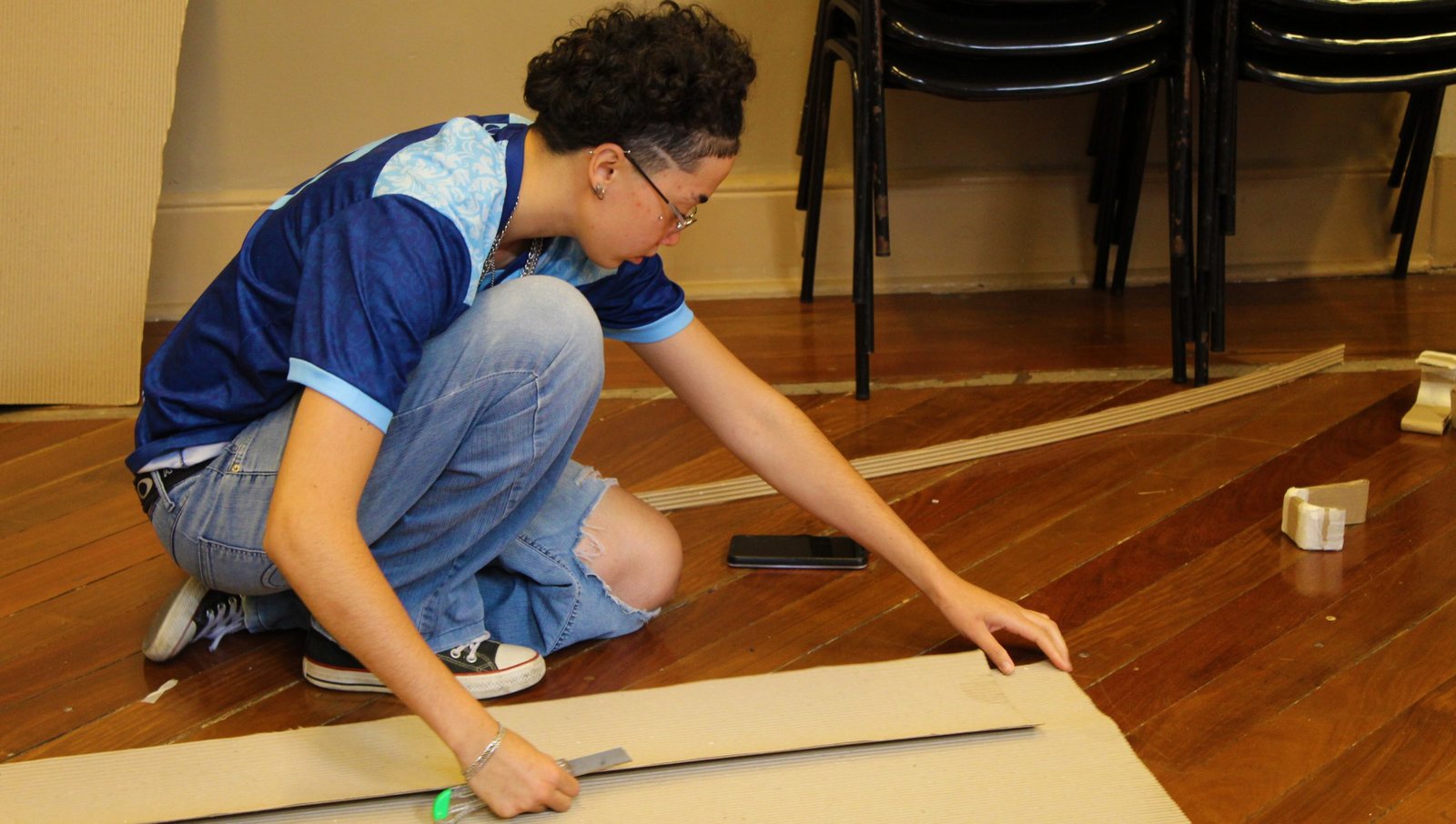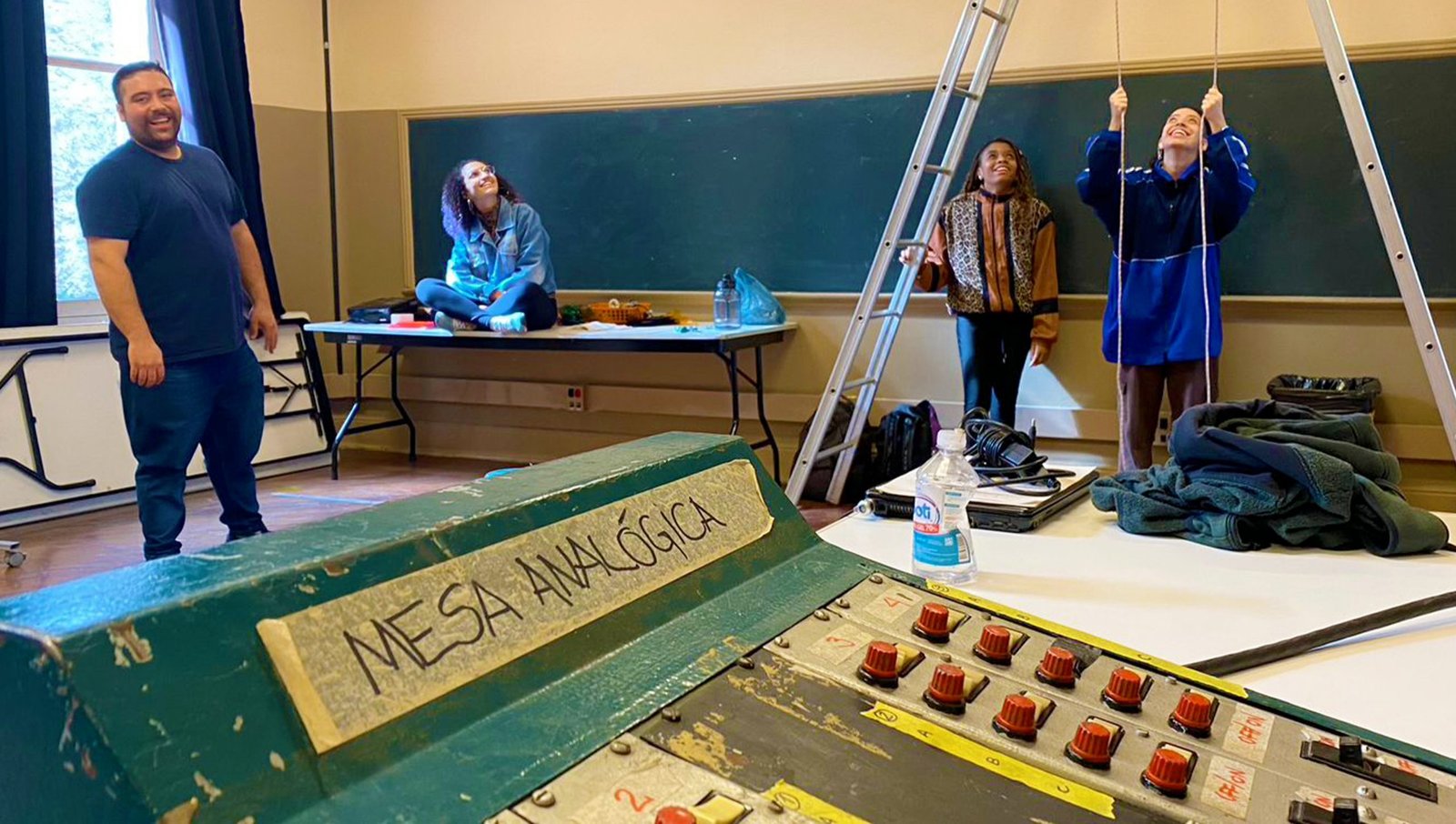 - Estudantes de Iluminação preparam exercício na sede Brás da SP Escola de Teatro. Junho de 2023. | Foto: Comunicação SP Escola de Teatro