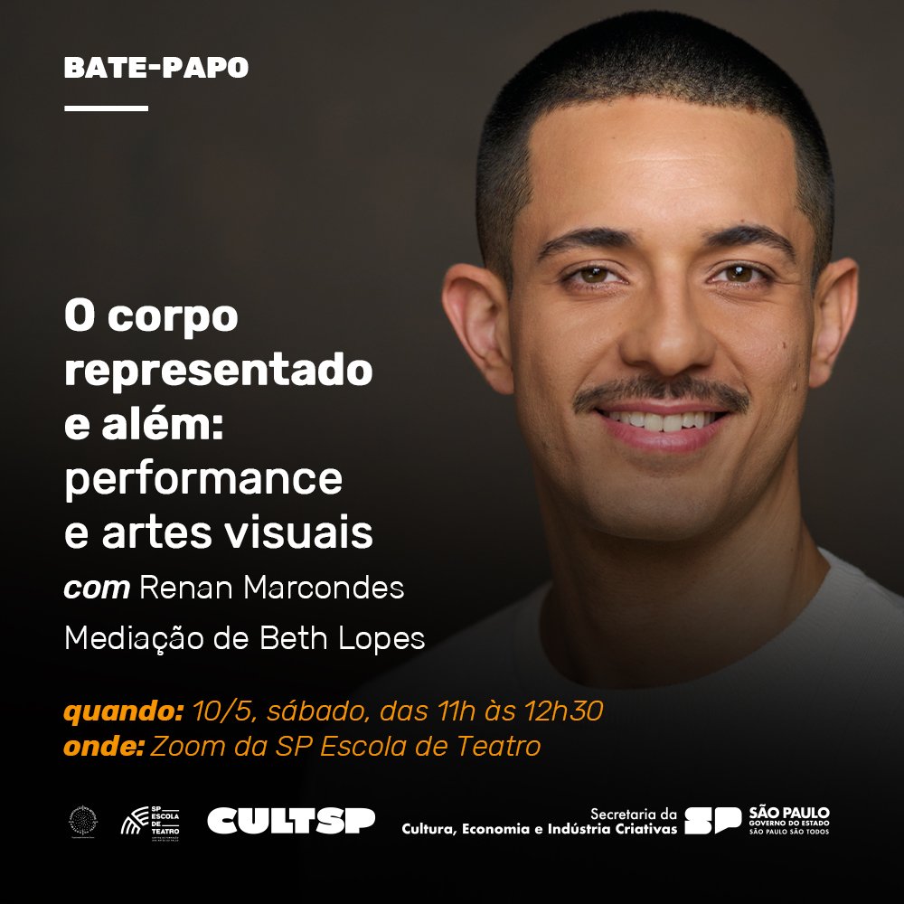 Os estudantes do Módulo Azul dos oito cursos técnicos da SP Escola de Teatro participam de um bate-papo online neste sábado (10), com o convidado Renan Marcondes e a coordenadora pedagógica Beth Lopes como mediadora.