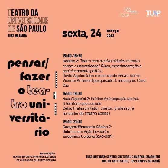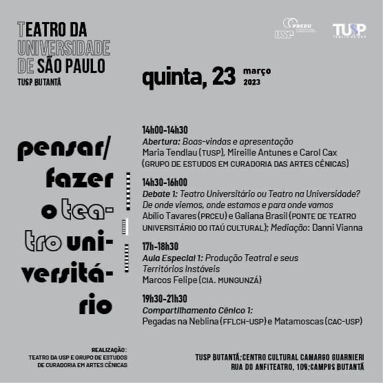 Acontece de 23 a 25 de março o evento “Pensar/Fazer O Teatro Universitário”, promovido pelo Grupo de Estudos em Curadoria das Artes Cênicas, em parceria com o novo Teatro da USP (TUSP) Butantã, no campus da Universidade de São Paulo no bairro do Butantã. O novo TUSP se soma ao espaço tradicional na rua Maria Antônia, no centro da cidade.