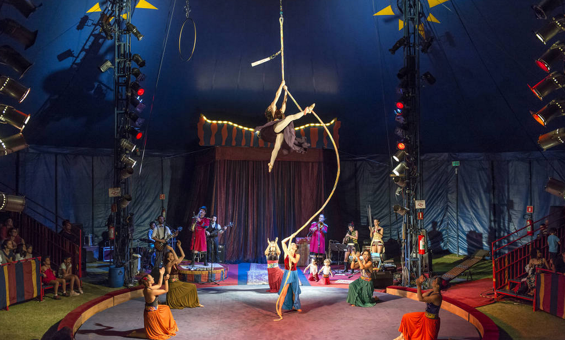 Números aéreos, acrobacia, equilíbrio e magia estão no espetáculo do Circo Zanni, apresentado no sábado (14). Foto: Carlos Gueller/Divulgação.