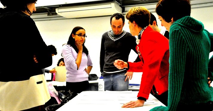 Veridiana Piovezan (de vermelho) analisa os projetos dos participantes (Foto: Arquivo SP Escola de Teatro)