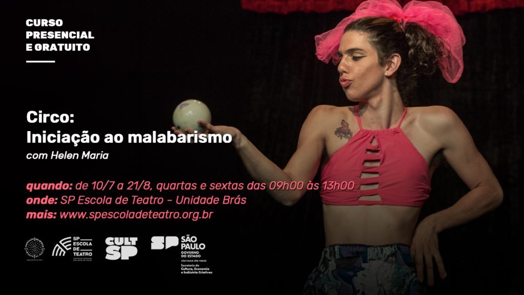 Estão abertas as inscrições para o curso de extensão presencial e gratuito “Circo: Iniciação ao Malabarismo”, ministrado na SP Escola de Teatro por Helen Maria.