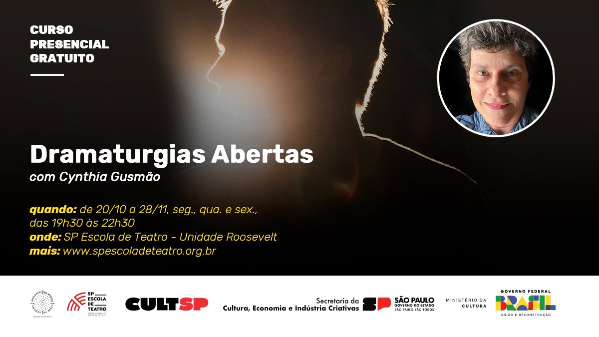 Estão abertas até 15 de outubro as inscrições para o curso de extensão presencial e gratuito “Dramaturgias Abertas”, a ser ministrado por Cynthia Gusmão.