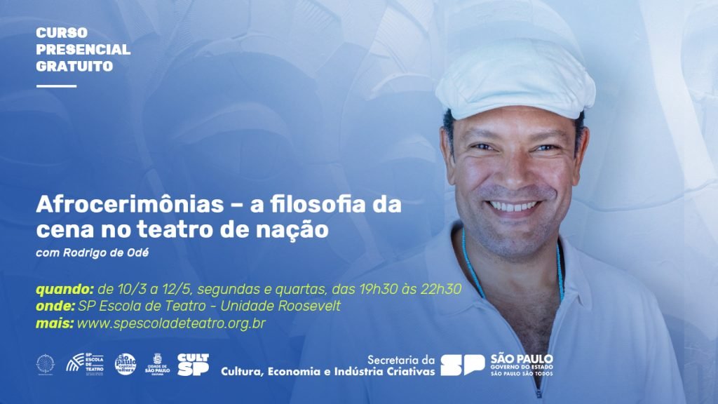 Estão abertas até 3 de março as inscrições para o curso de extensão presencial e gratuito “Afrocerimônias – a filosofia da cena no teatro de nação”, ministrado por Rodrigo de Odé e oferecido pela área de Extensão Cultural da SP Escola de Teatro – Centro de Formação das Artes do Palco.