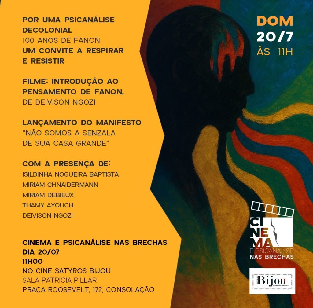 Com apresentação do filme “Introdução ao pensamento de Fanon” (2016), de Deivison Ngozi e a presença de: Isildinha Nogueira Baptista, Miriam Chnaidermann, Miriam Debieux, Thamy Ayouch e Deivison Ngozi