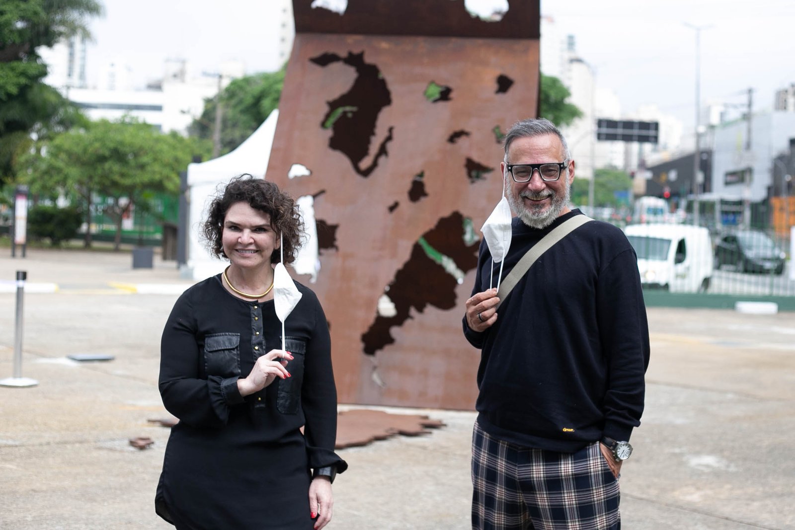 A assessora de Comunicação Institucional do Memorial da América Latina Karina Marraccini ao lado de Duilio Malfatti, coordenador de Marketing e Projetos Especiais do Sebrae-SP na inauguração da obra de Maria Bonomi – Foto: Rafa Marques/Adaap