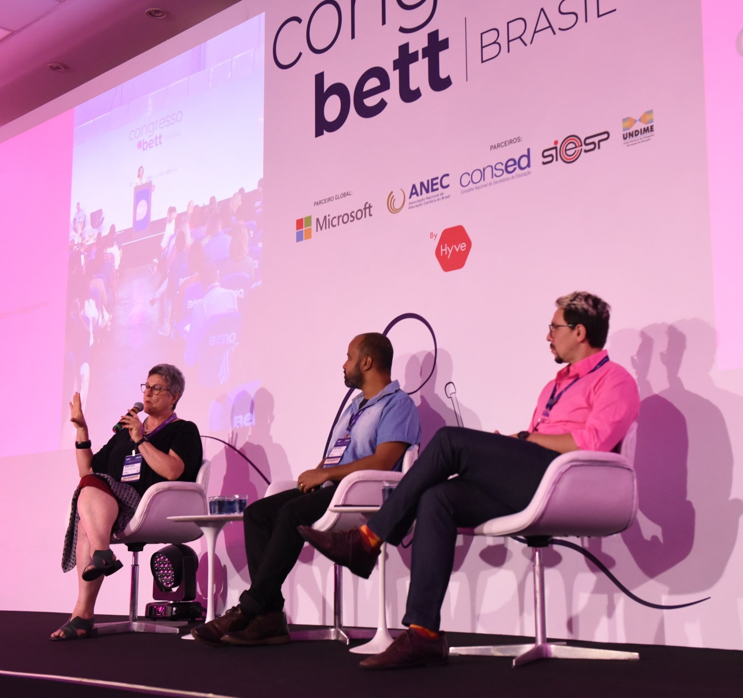 Marina Toledo, do Museu da Língua Portuguesa, Miguel Arcanjo Prado, da SP Escola de Teatro, e Cauê Donato, do Museu Catavento, na Bett Brasil