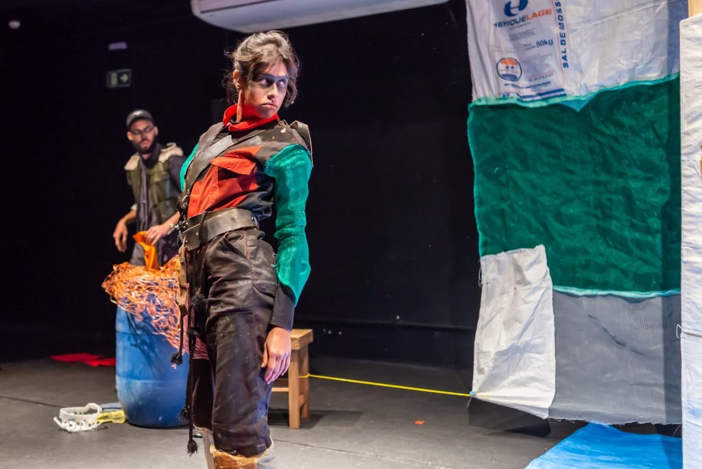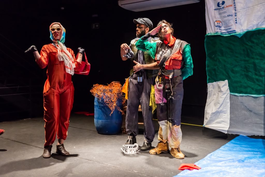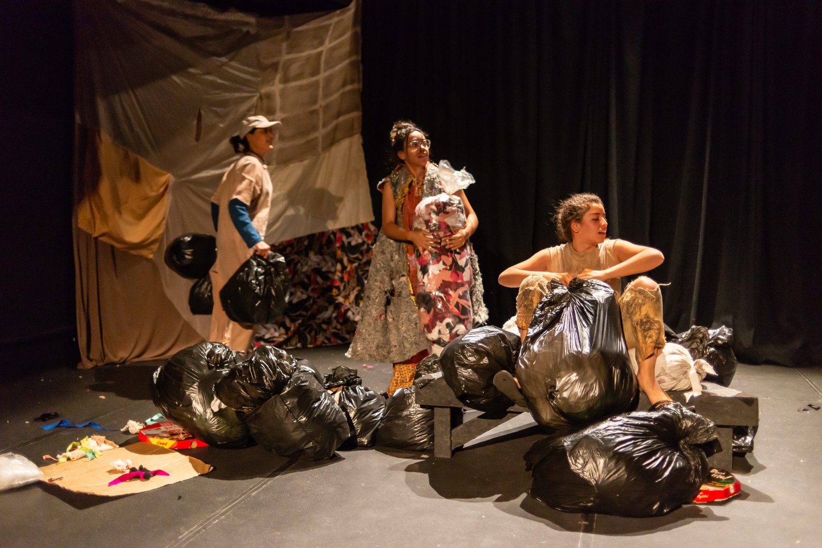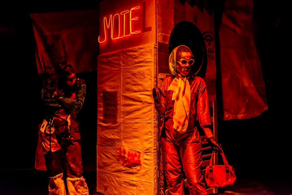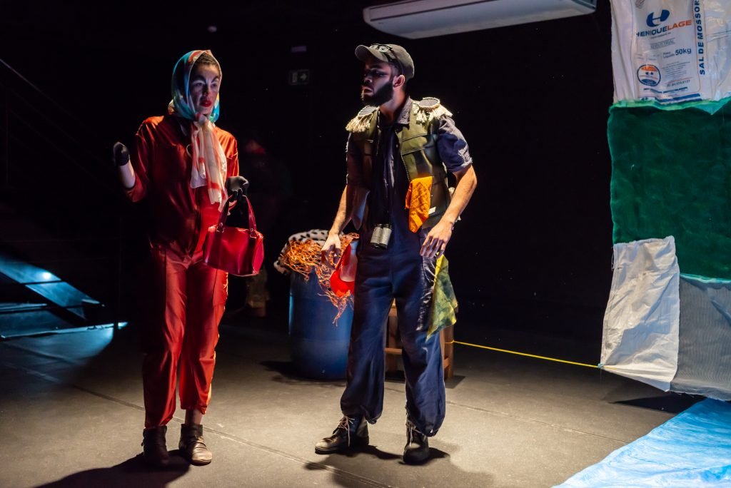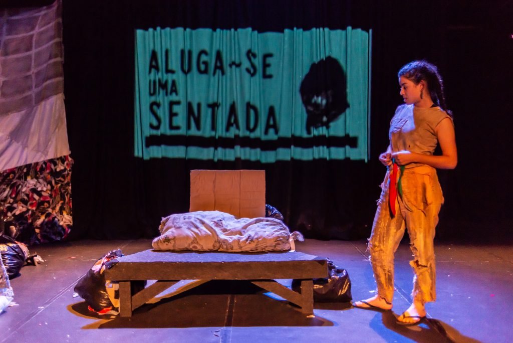 “Nas encruzilhadas da cidade, uma pilha de sacos de lixo entre a pizzaria e o metrô é o ponto de encontro de tensões e distensões entre um dono de pizzaria cidadão de bem; uma criança em situação de rua; uma artista em situação de rua que recicla para criar e viver; e um coletor de lixo. É a disputa do território; a assistência e controle social da rua; a fome e a inocência humanas; a arte como forma de sobrevivência se parindo resistência política em tempos de guerra. Sacos de lixo que afetam e são afetados, modificam-se diante dos conflitos existentes para conversar: há espaço para a mudança sentar conosco no tempo presente? ”
