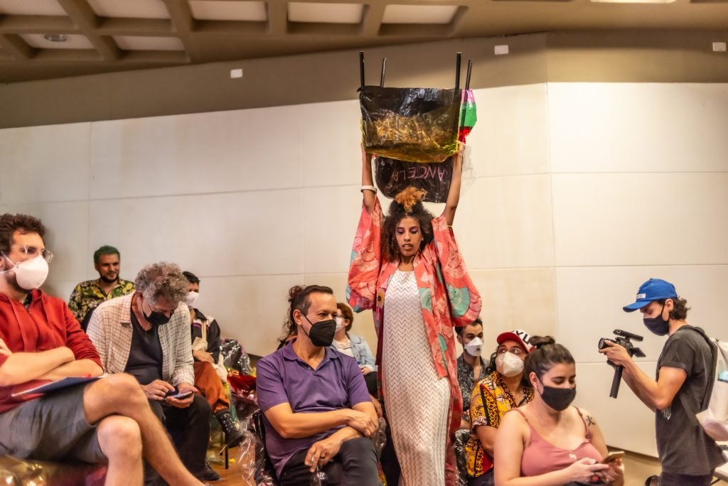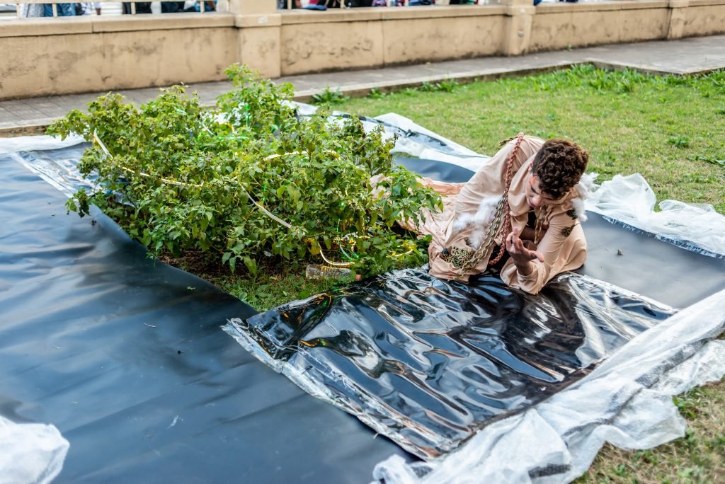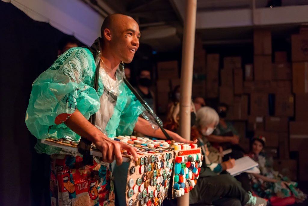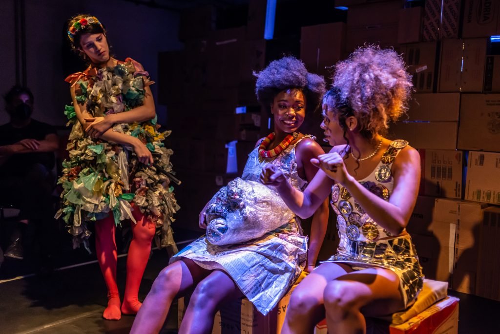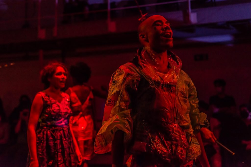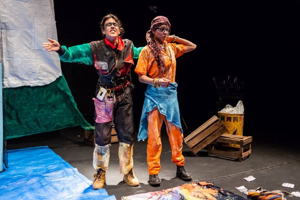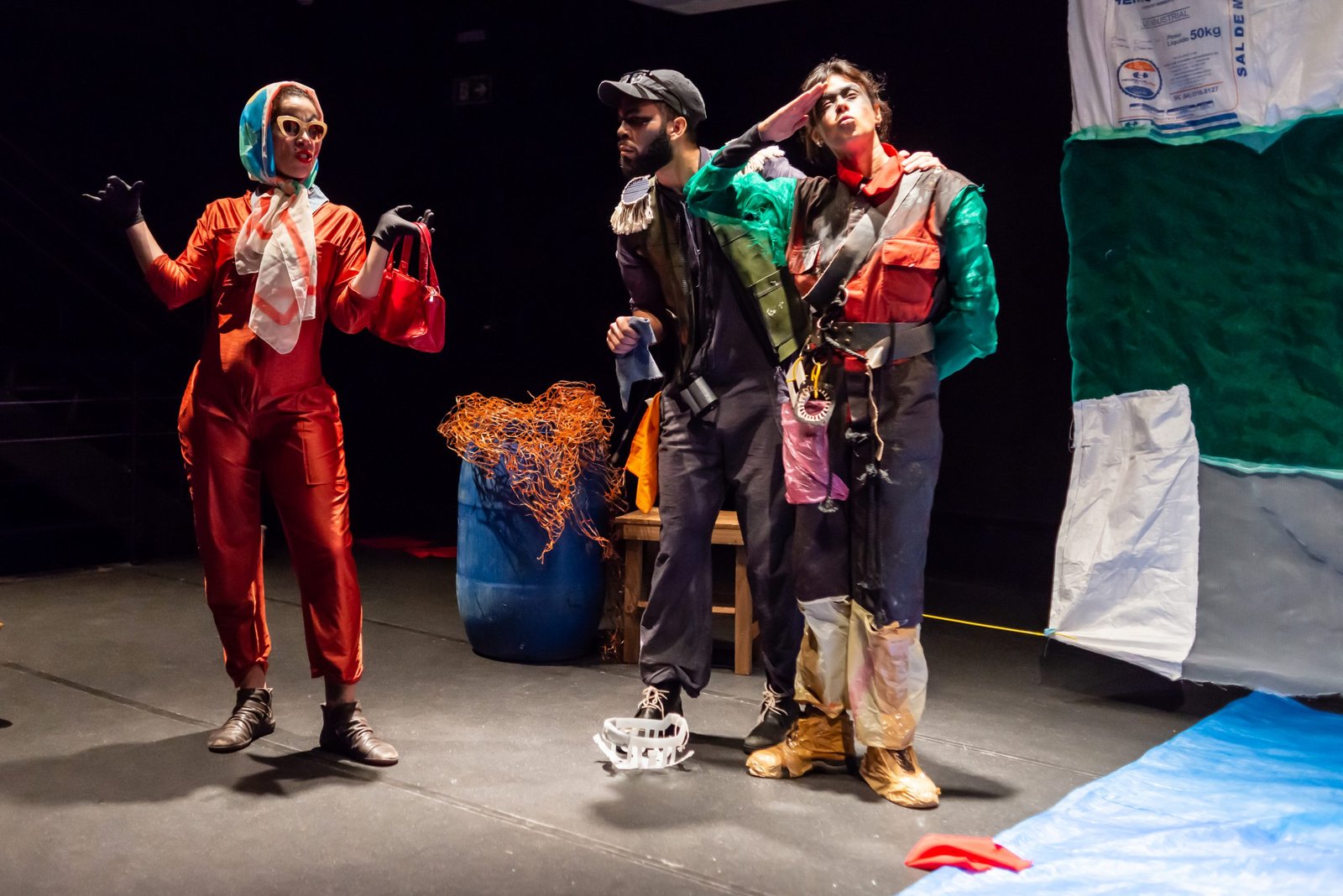 “Nas encruzilhadas da cidade, uma pilha de sacos de lixo entre a pizzaria e o metrô é o ponto de encontro de tensões e distensões entre um dono de pizzaria cidadão de bem; uma criança em situação de rua; uma artista em situação de rua que recicla para criar e viver; e um coletor de lixo. É a disputa do território; a assistência e controle social da rua; a fome e a inocência humanas; a arte como forma de sobrevivência se parindo resistência política em tempos de guerra. Sacos de lixo que afetam e são afetados, modificam-se diante dos conflitos existentes para conversar: há espaço para a mudança sentar conosco no tempo presente? ”