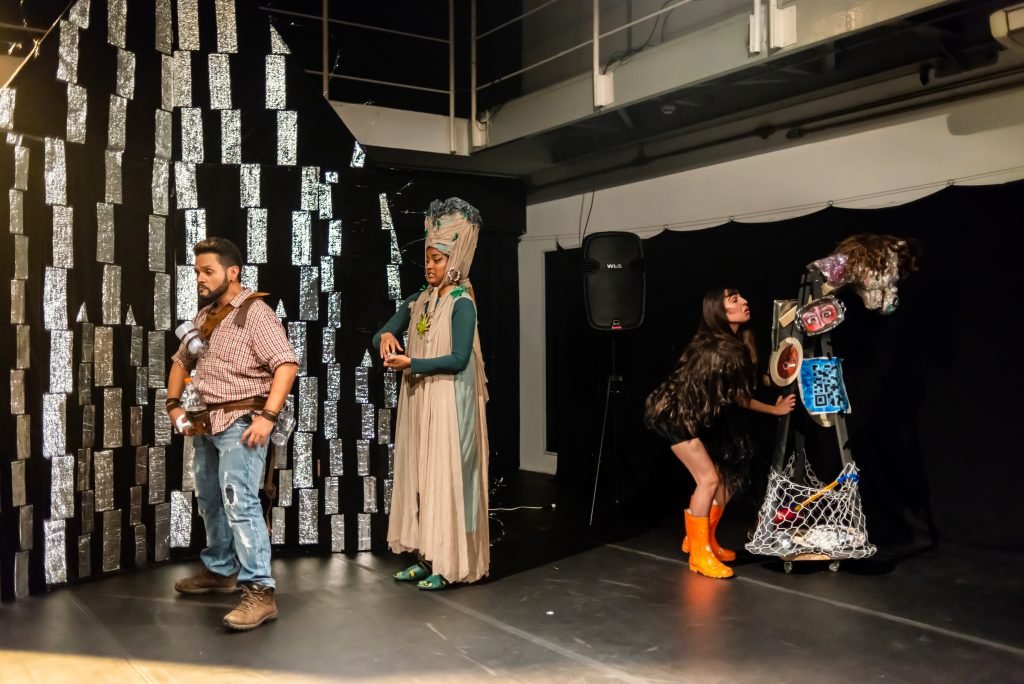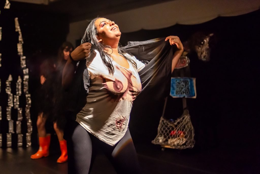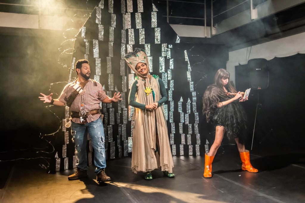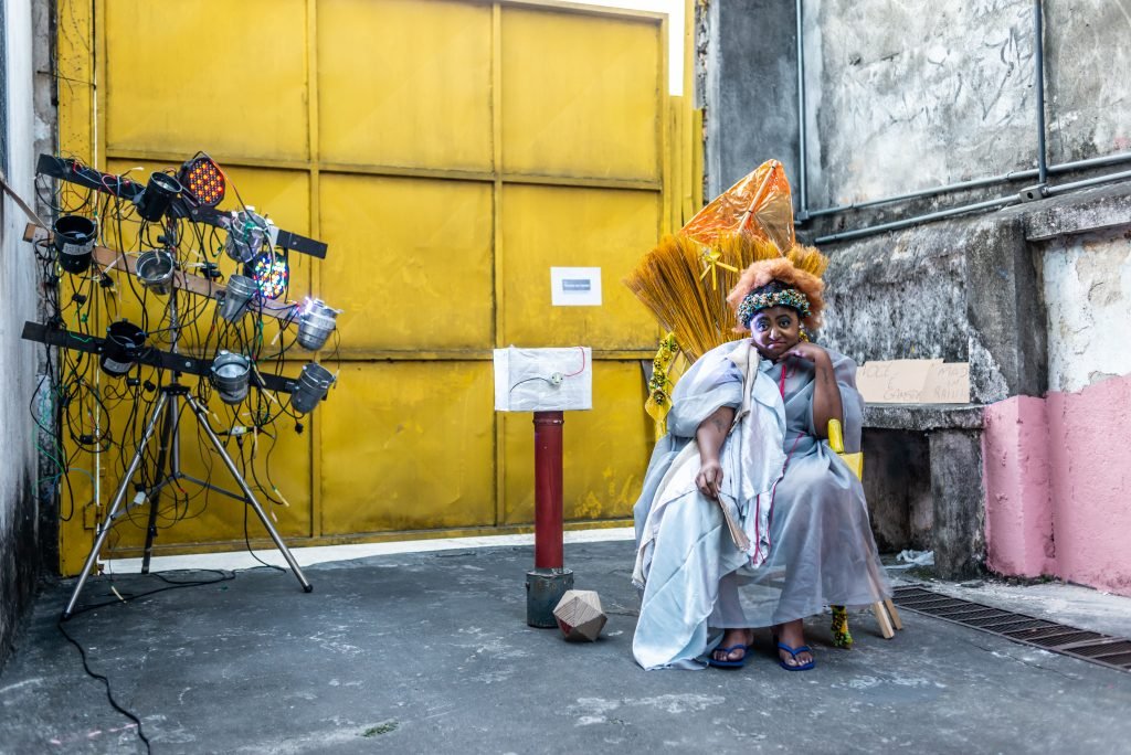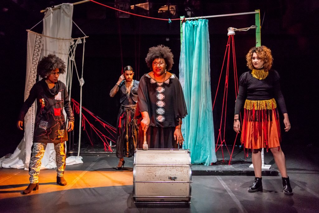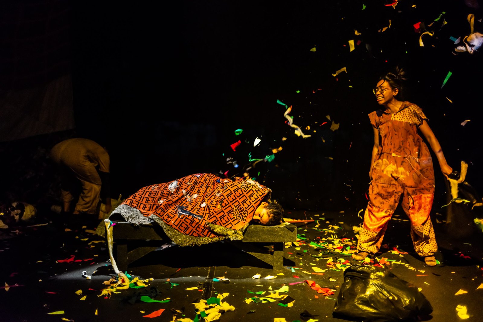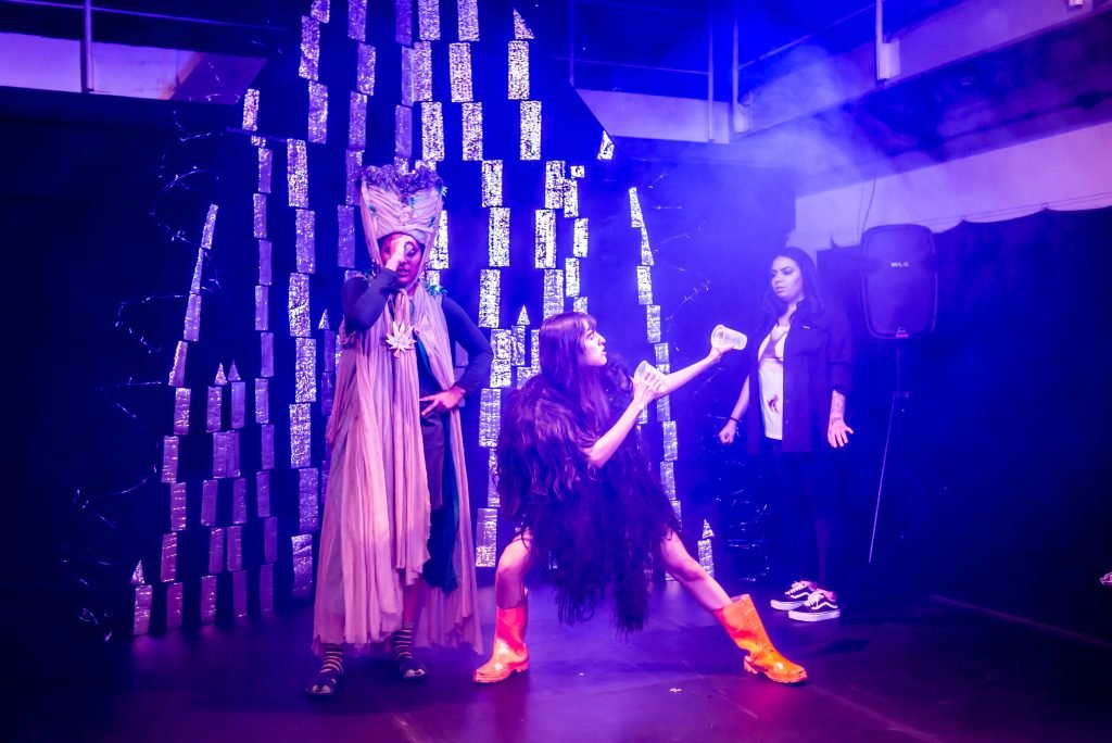 “Nas encruzilhadas da cidade, uma pilha de sacos de lixo entre a pizzaria e o metrô é o ponto de encontro de tensões e distensões entre um dono de pizzaria cidadão de bem; uma criança em situação de rua; uma artista em situação de rua que recicla para criar e viver; e um coletor de lixo. É a disputa do território; a assistência e controle social da rua; a fome e a inocência humanas; a arte como forma de sobrevivência se parindo resistência política em tempos de guerra. Sacos de lixo que afetam e são afetados, modificam-se diante dos conflitos existentes para conversar: há espaço para a mudança sentar conosco no tempo presente? ”