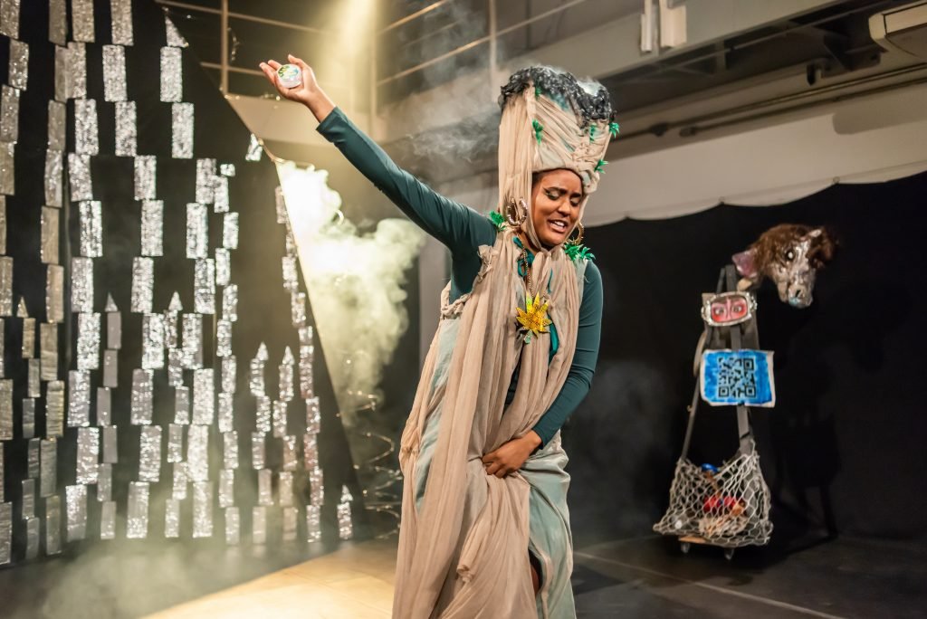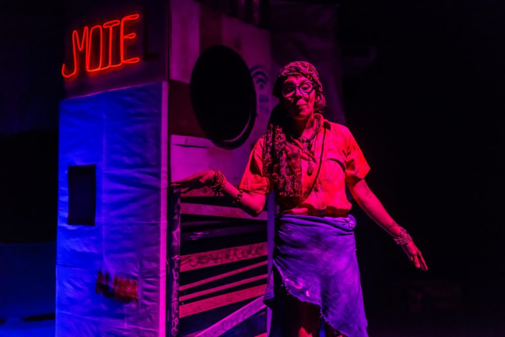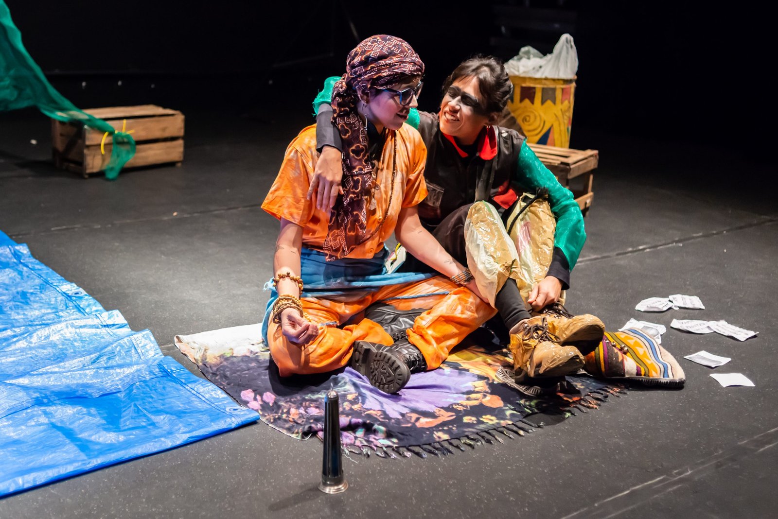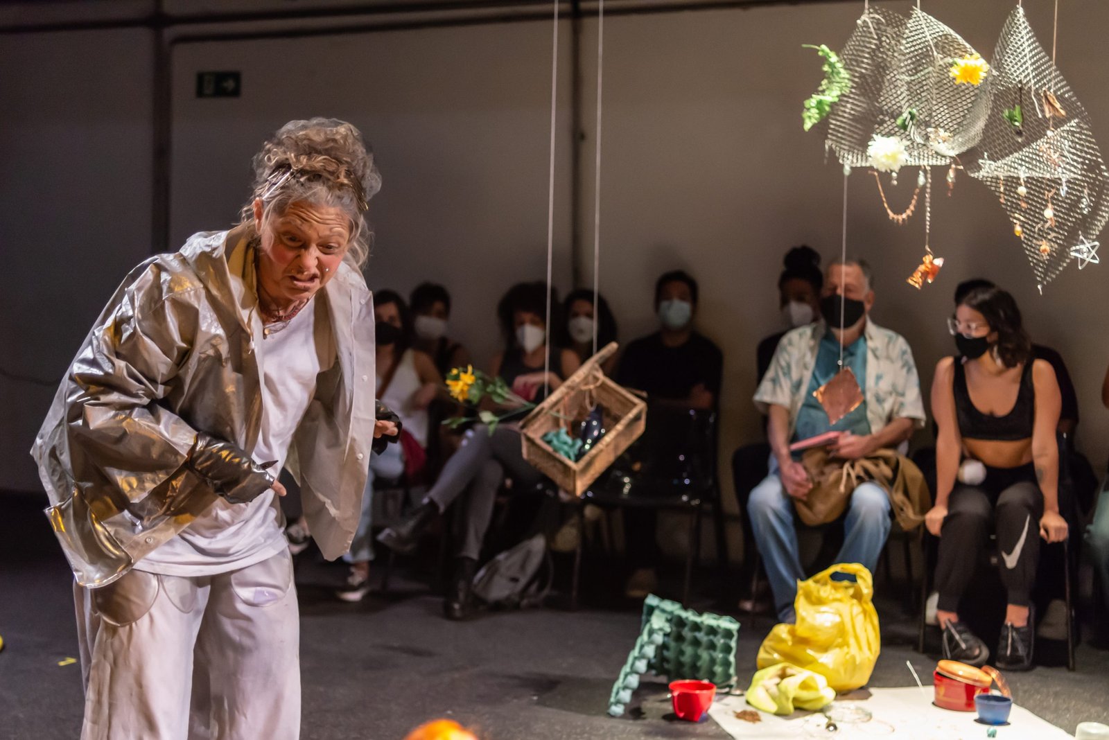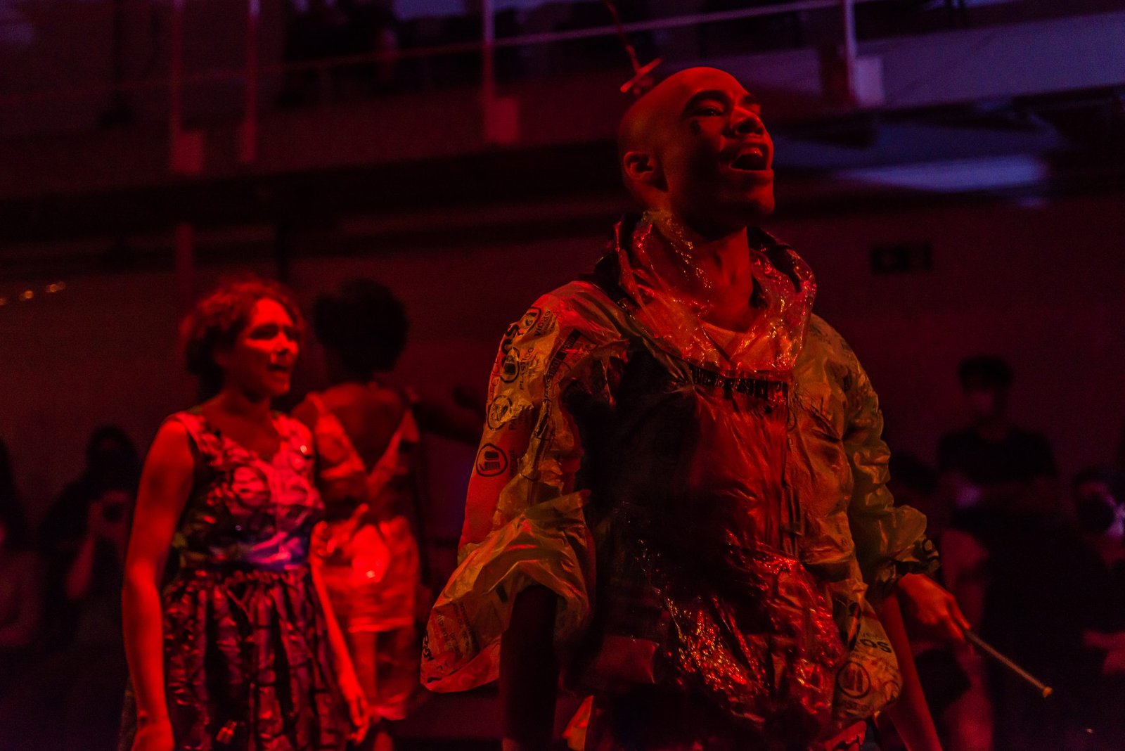 “Nas encruzilhadas da cidade, uma pilha de sacos de lixo entre a pizzaria e o metrô é o ponto de encontro de tensões e distensões entre um dono de pizzaria cidadão de bem; uma criança em situação de rua; uma artista em situação de rua que recicla para criar e viver; e um coletor de lixo. É a disputa do território; a assistência e controle social da rua; a fome e a inocência humanas; a arte como forma de sobrevivência se parindo resistência política em tempos de guerra. Sacos de lixo que afetam e são afetados, modificam-se diante dos conflitos existentes para conversar: há espaço para a mudança sentar conosco no tempo presente? ”