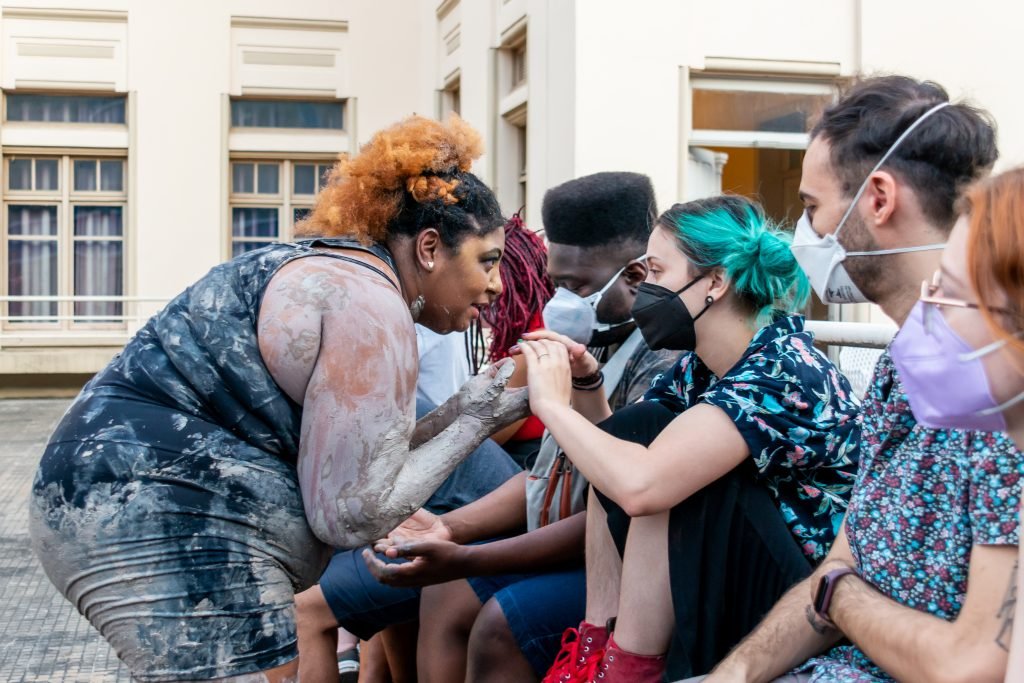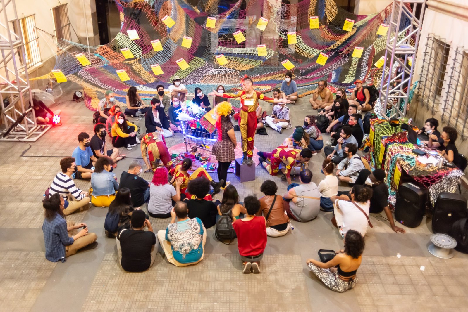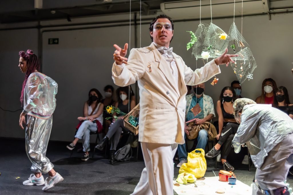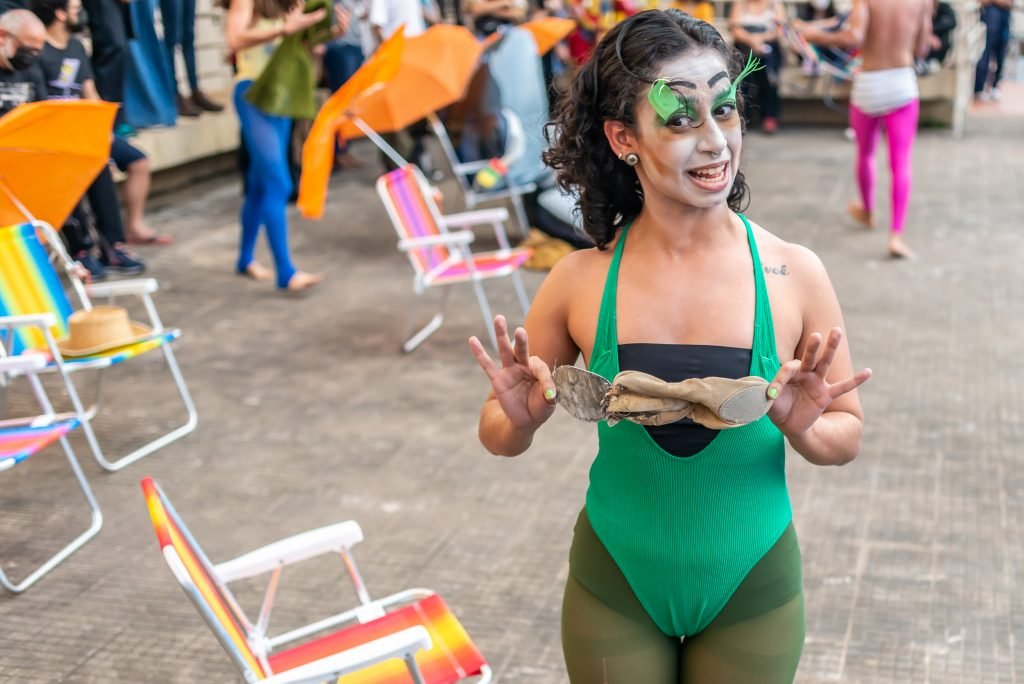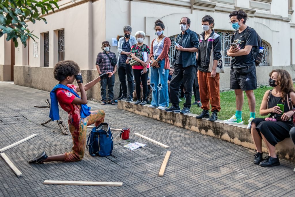 As poéticas de rua, material de estudo do primeiro semestre de 2022 no curso técnico da SP, trabalham questões relacionadas ao artista urbano e o seu lugar de ocupação/uso, que é a cidade. O assunto foi constantemente debatido e fundamentou as discussões desses últimos seis meses ao oferecer um rico material pedagógico e social que, explorado pelos estudantes, serviu de base para a construção das apresentações. Em geral, os objetos de pesquisa investigados foram as vivências e produções artísticas de artistas como Efigênia Rolim, Helio Leites, Zé Bolo Flô, Berna Reale e Leonardo Scantbelruy, sendo a performatividade o foco para o Módulo Azul e a relação personagem/conflito para o Verde.