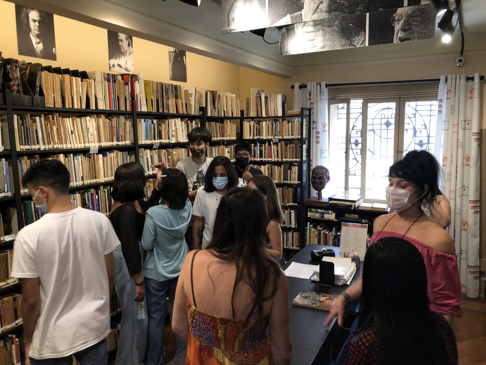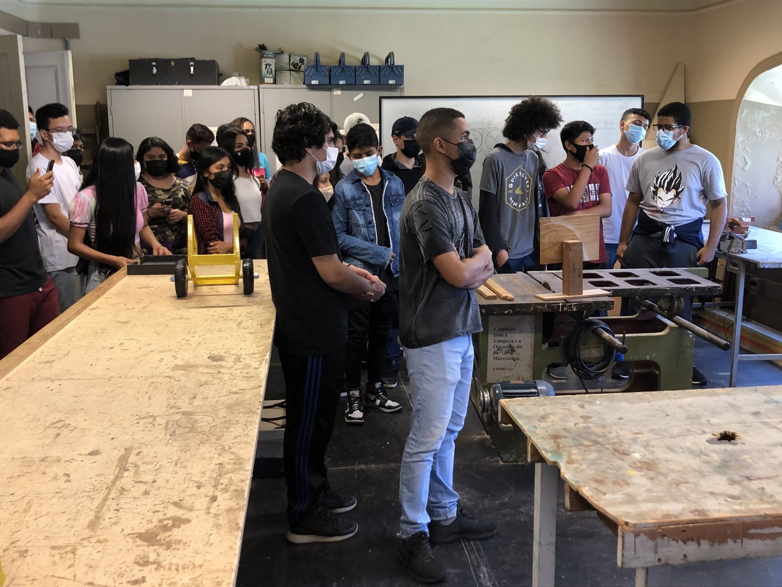 Desta vez, a analista pedagógica, Dione Leal, e a artista docente convidada de Técnicas de Palco, Beatriz Mendes, recepcionaram os jovens estudantes e apresentaram todos os espaços da Escola, entre eles a exposição Universo Pagú, as maquetes de cenografias teatrais criadas pelo cenógrafo e arquiteto J. C. Serroni, os ateliês de Cenografia e Figurino, as oficinas de criação da linha de estudo de Técnicas de Palco, o anfiteatro, as salas de aula, a biblioteca e o acervo de Antônio Abujamra.