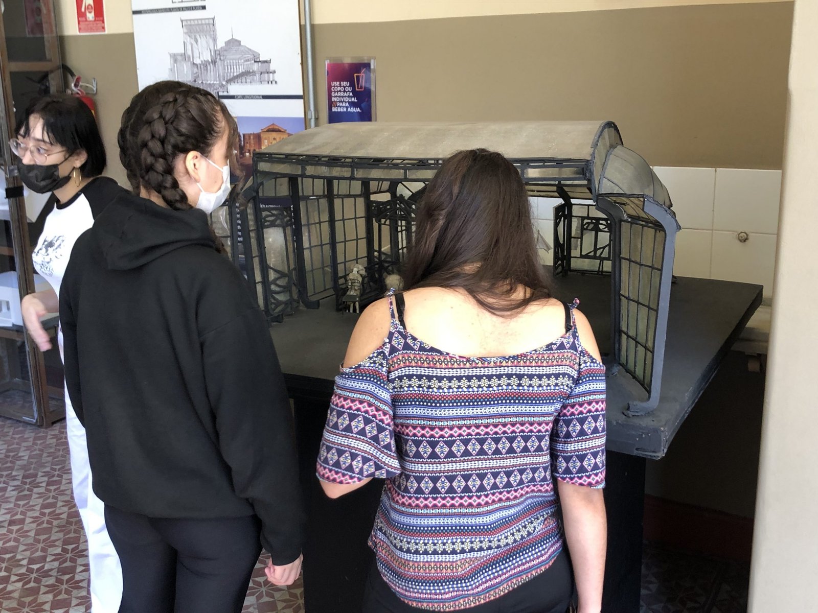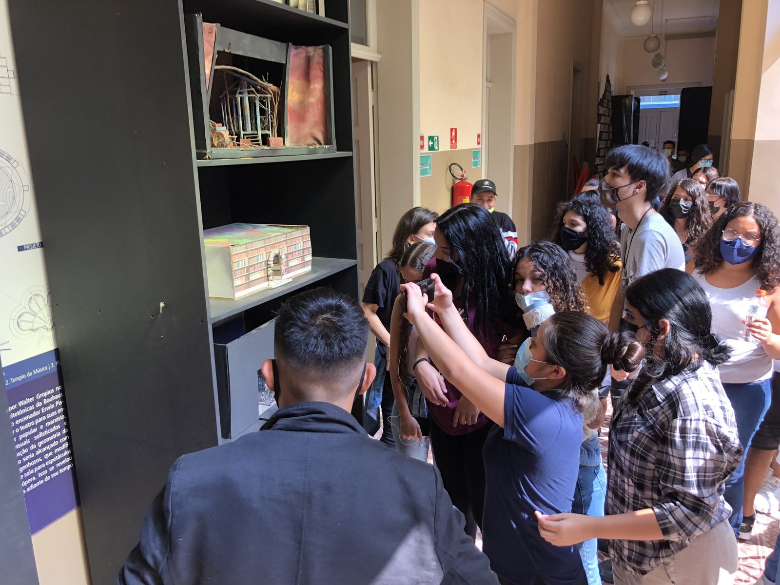 Estudantes da Escola Estadual Padre Anchieta em frente as maquetes de cenografias teatrais criadas pelo cenógrafo J. C. Serroni. Foto: Comunicação SP Escola de Teatro