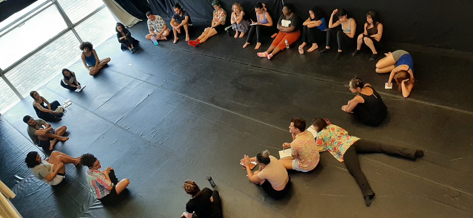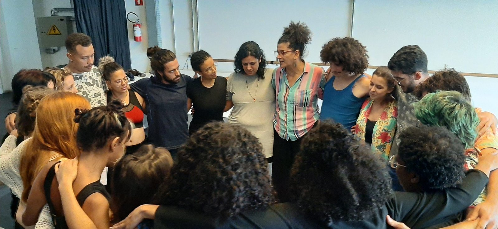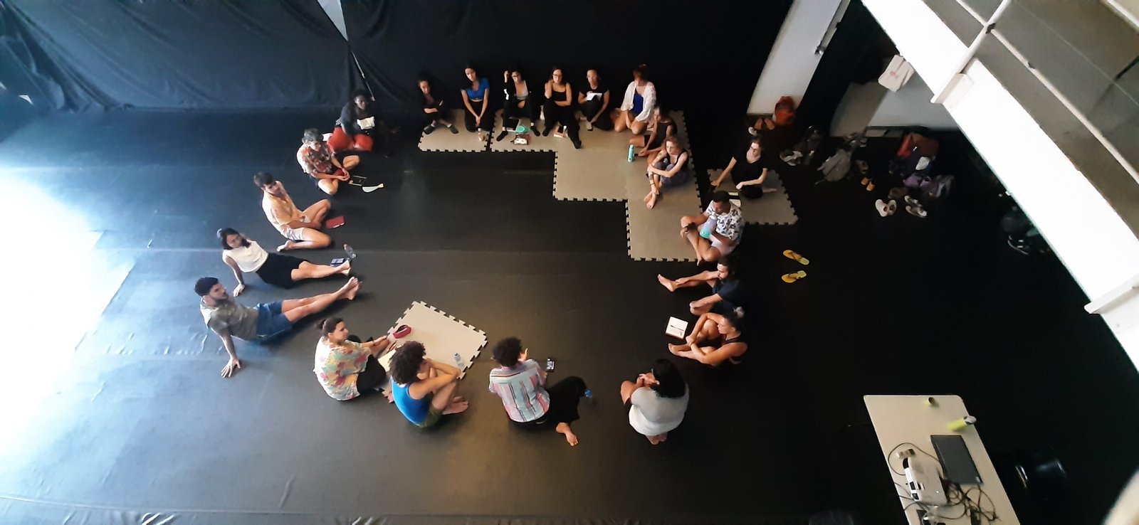 Durante a aula, a artista compartilhou um pouco sobre o seu processo criativo e sua trajetória artística, relacionando performatividade com estado de presença, dando o exemplo de sua palhaça Bandeira.