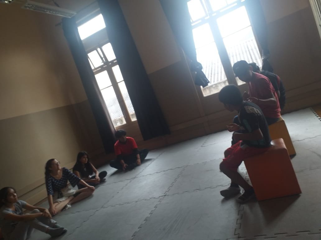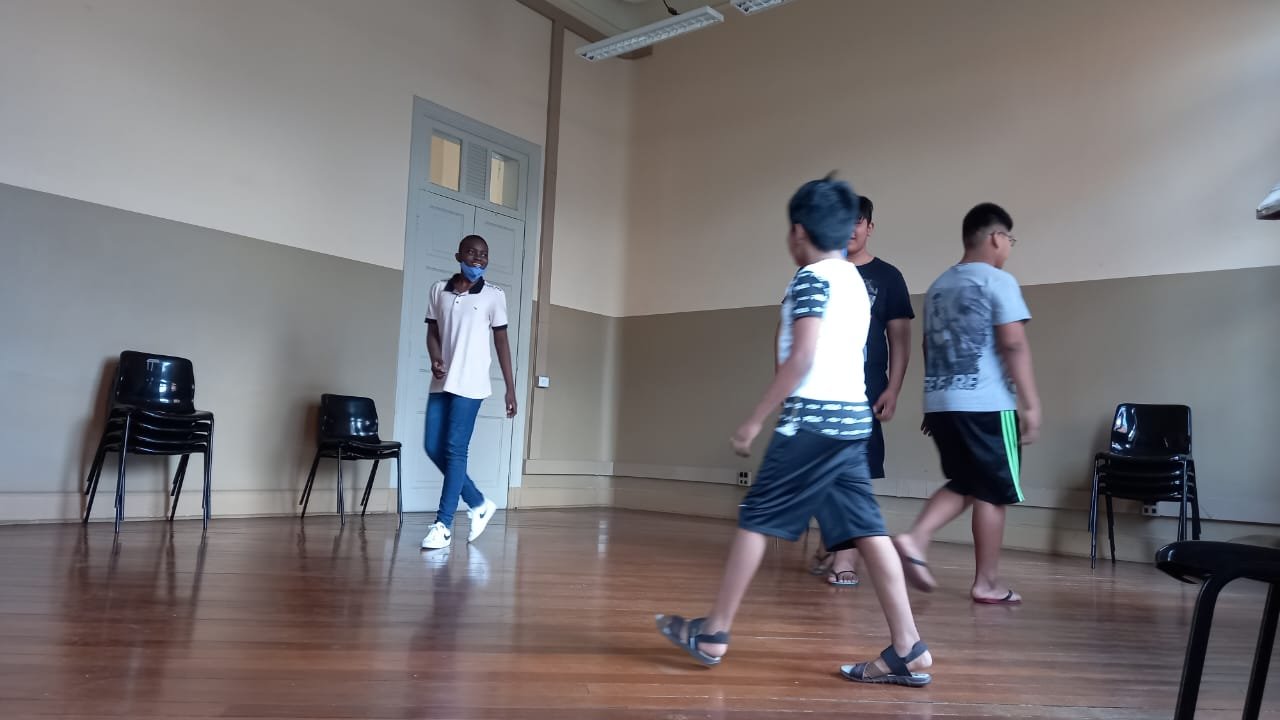Diego: A experiência de ministrar junto a Nathalia foi muito interessante e muito divertida, as tardes passavam super rápidas e eram produtivas. Acho importante frisar que era uma iniciação ao teatro, aos jogos teatrais e a criação de uma mini cena. Nenhum dos jovens tinham qualquer experiência com a cena ou com jogos teatrais, então a música, a brincadeira e a nossa escuta como condutores estavam sempre presentes nos encontros. Muito do que eu estava trabalhando como estudante nas aulas da SP foi adaptado e passado para os encontros dos jovens, isso foi legal para o aprendizado e para memorizar jogos e exercícios.