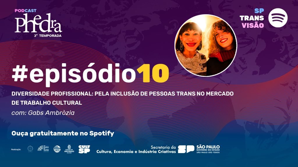 Está no ar o décimo e último episódio da terceira temporada do podcast, com a convidada Gabs Ambròzia, abordando o tema “Diversidade profissional: pela inclusão de pessoas trans no mercado de trabalho cultural” e “Cena, caos e travessia: por um mercado cultural mais transbordante e trans”.