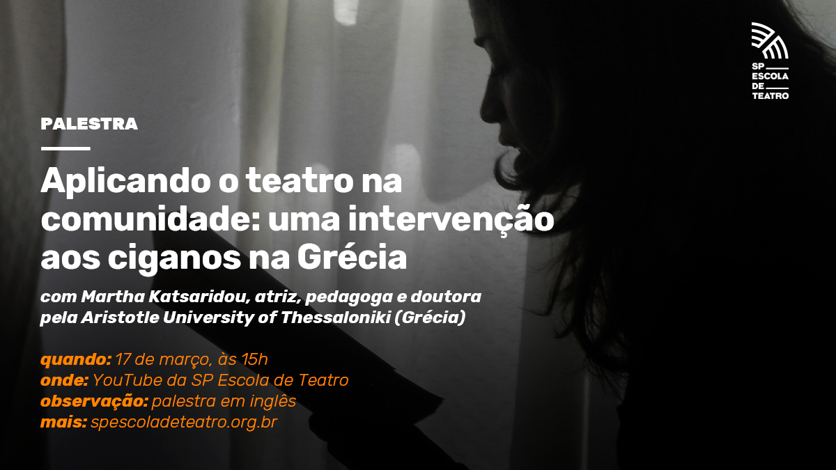 Acontece na próxima quinta-feira, 17, a palestra internacional Aplicando o teatro na comunidade: uma intervenção aos ciganos na Grécia, com Martha Katsaridou, atriz, pedagoga, doutora pela Αristotle University of Thessaloniki, na Grécia, com tese sobre o ensino da literatura através do teatro. O evento será em inglês e transmitido no Youtube da SP Escola de Teatro.