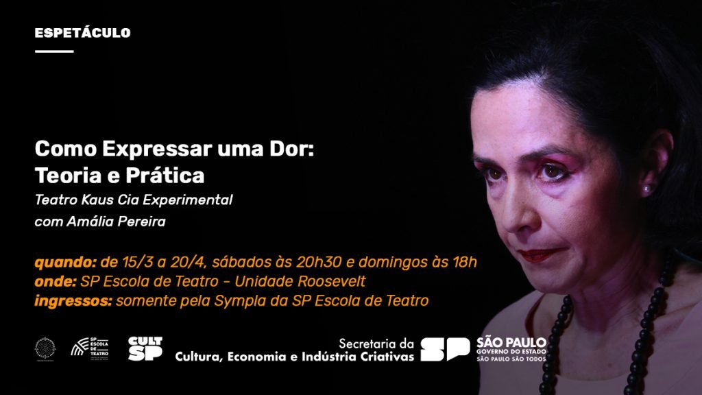 COMO EXPRESSAR UMA DOR: TEORIA E PRÁTICA – Estreia dia 15 de março, sábado, às 20h30. Texto: Aimar Labaki. Direção: Reginaldo Nascimento. Com o Teatro Kaus Cia Experimental. Elenco: Amália Pereira. Duração: 80 minutos. Gênero: Humor ácido. Recomendação: 14 anos. Ingressos: R$ 40,00 (inteira) e R$ 20,00 (meia). Sábados, às 20h30. Domingo, às 18h. Até 20 de abril.