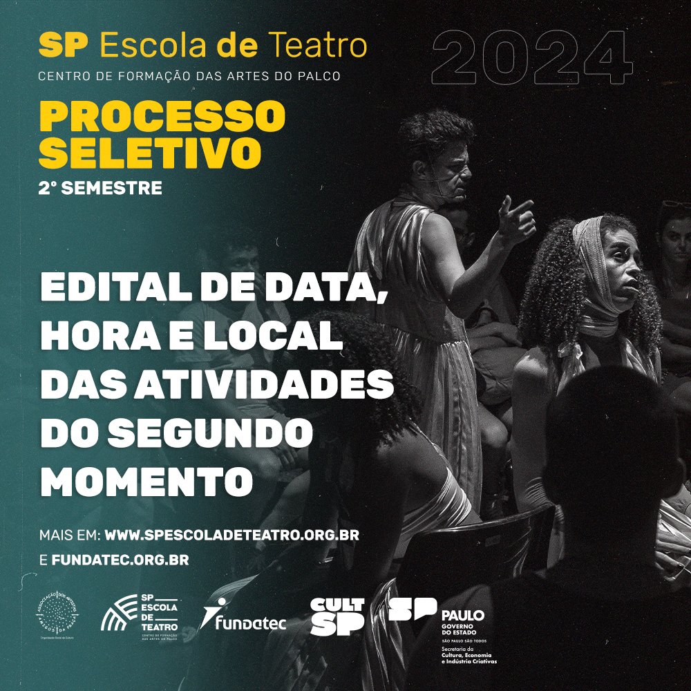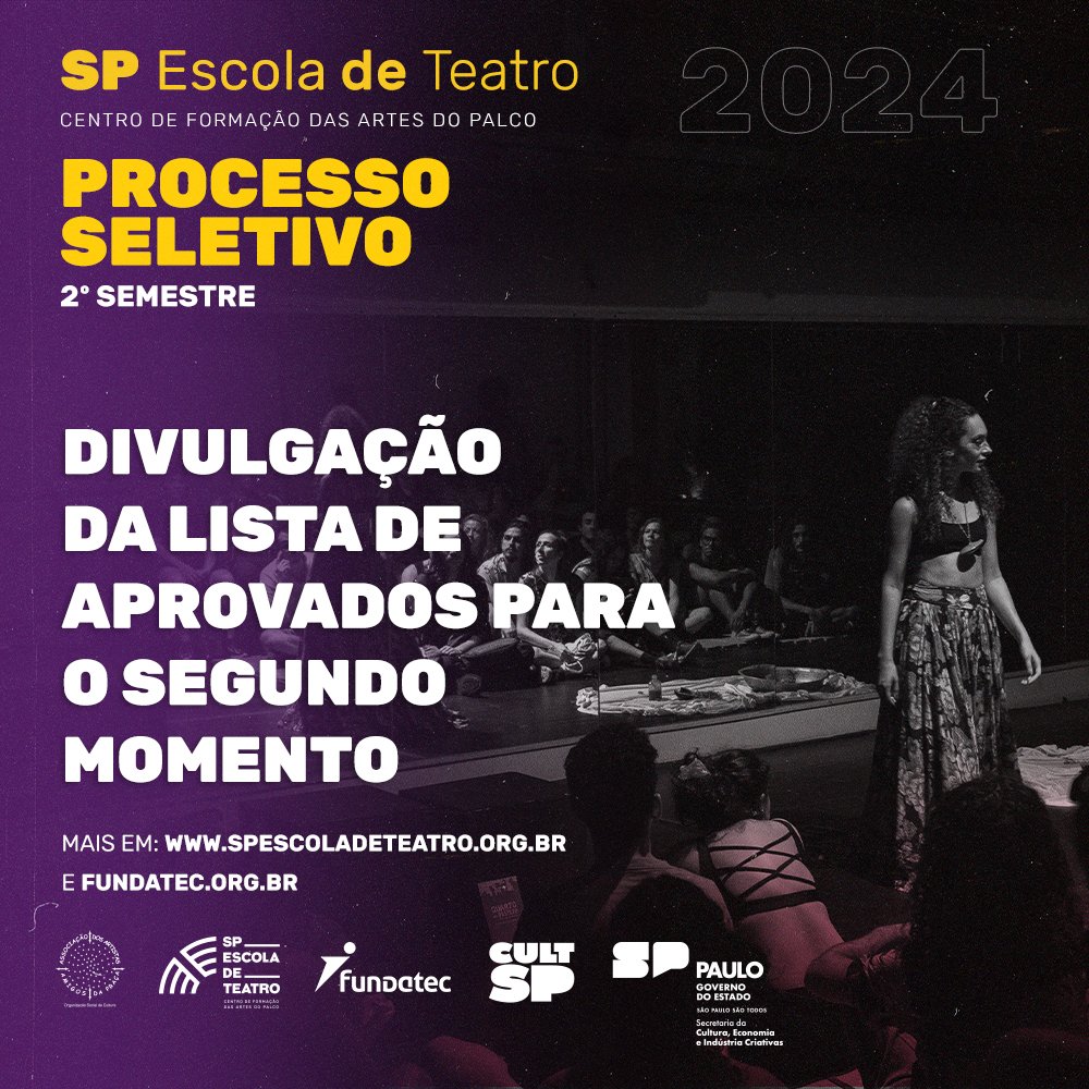 Conforme previsto no edital publicado em 3/5/2024 no site da SP Escola de Teatro, a Instituição divulga hoje (5) a lista de convocados para as atividades de Segundo Momento, referente ao Processo Seletivo para as turmas do 2º semestre de 2024. A Fundatec é a empresa responsável pelo processo seletivo.