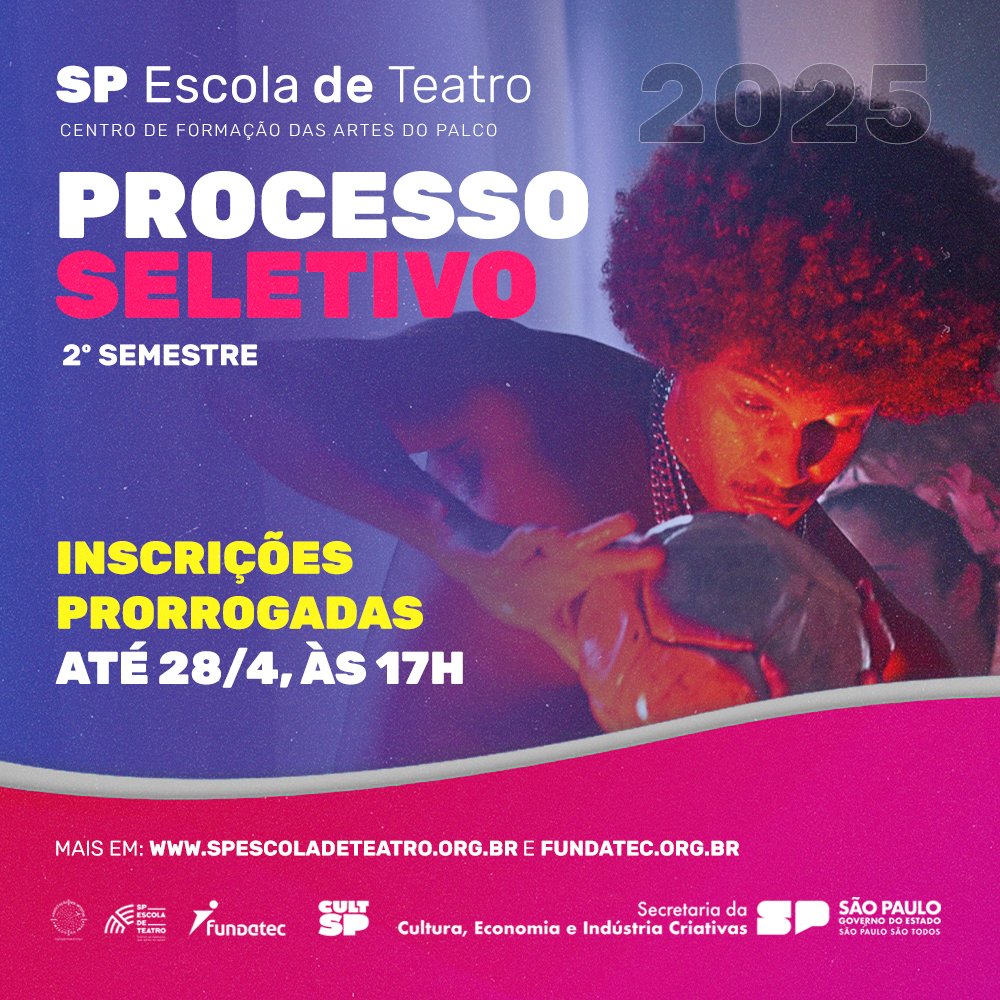 A Fundatec e a SP Escola de Teatro – Centro de Formação das Artes do Palco prorrogaram até as 17h de 28/4 as inscrições para o Processo Seletivo do segundo semestre de 2025.