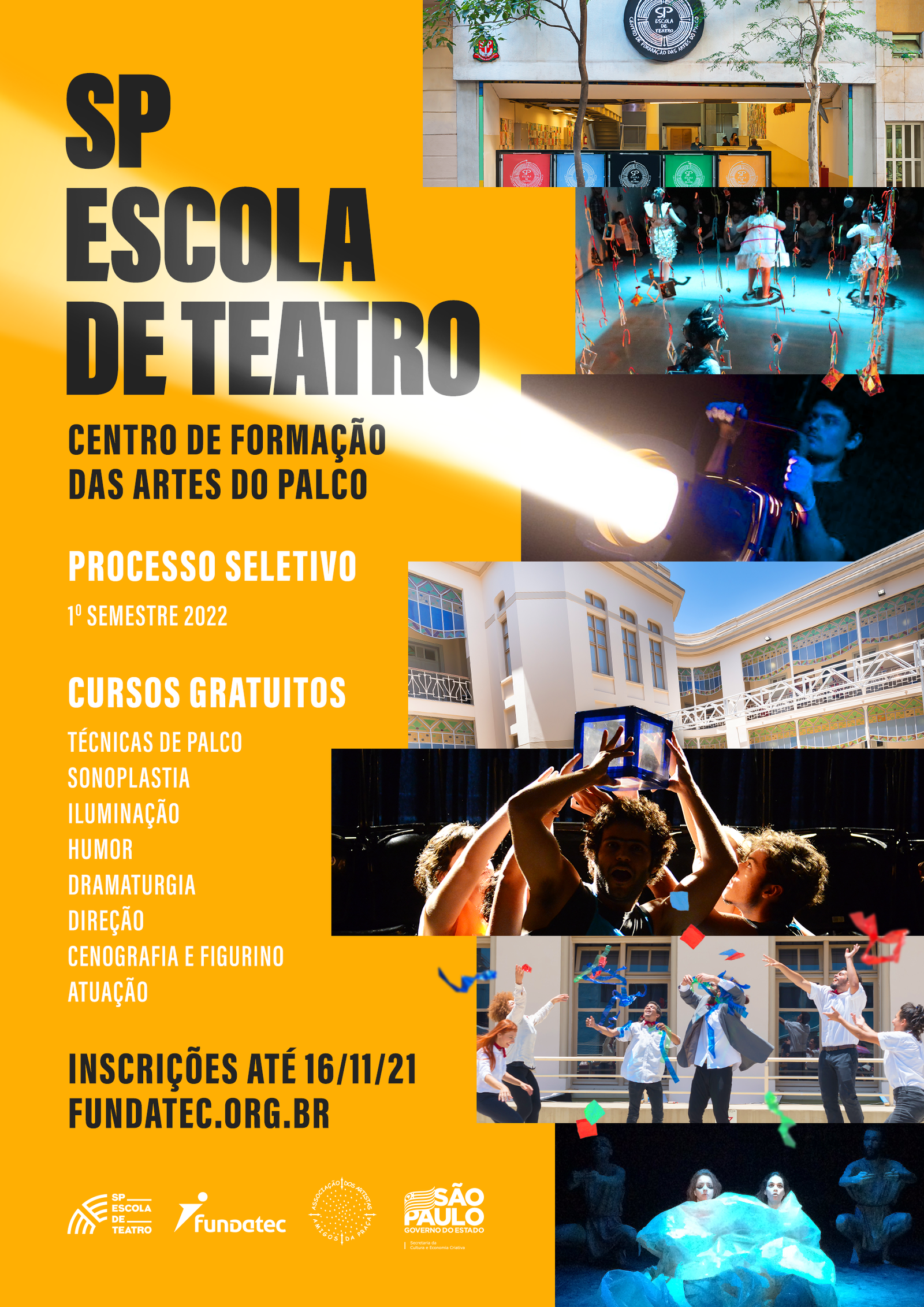 A SP Escola de Teatro, instituição da Secretaria de Cultura e Economia Criativa do Estado e gerida pela Associação dos Artistas Amigos da Praça (Adaap), está com inscrições abertas para as novas turmas do curso técnico em teatro, com aulas no início do primeiro semestre de 2022.