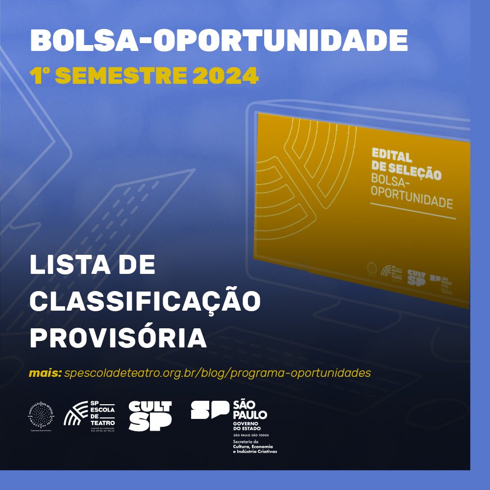 O Programa Oportunidades da SP Escola de Teatro divulgou hoje (20) a lista de classificação provisória para as 75 bolsas ofertadas no edital do primeiro semestre de 2024.