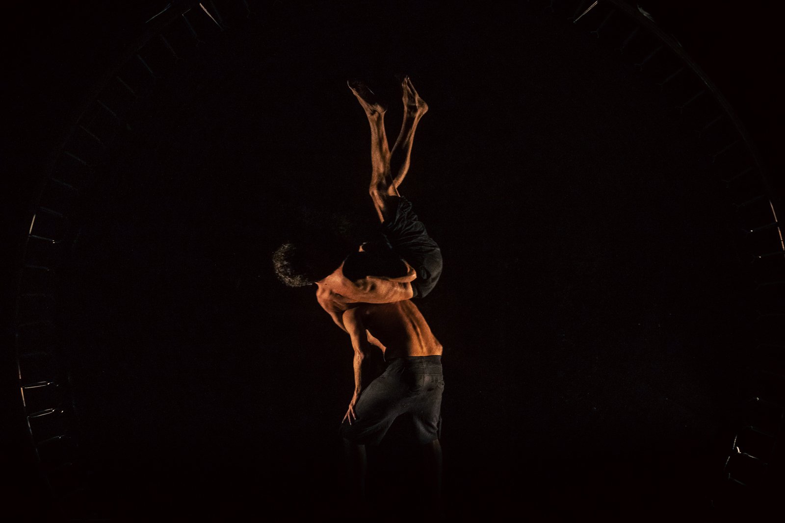 Foram praticamente dois anos de criação, pelo adiamento da estreia, causado pela pandemia, portanto foi um processo bem longo. Começamos com a palavra propulsora do “medo”, mas isso foi se diluindo, porque fomos indo muito para a abstração e para uma pesquisa muito mais híbrida, bebendo na mitologia, nas artes plásticas, uma pesquisa imagética, do cinema, do qual nos aproximamos, dessa fusão de corpos que se entrelaçam com as imagens e que cria um ilusionismo em 3D. A gente foi se debruçando em cima do tema do abismo, do duplo, do ser perder para se resgatar, dos abismos em si, fomos para uma abstração desse arquétipo do homem que se perdeu e que tenta se resgatar. Esse foi o fio final de nossa condução.
