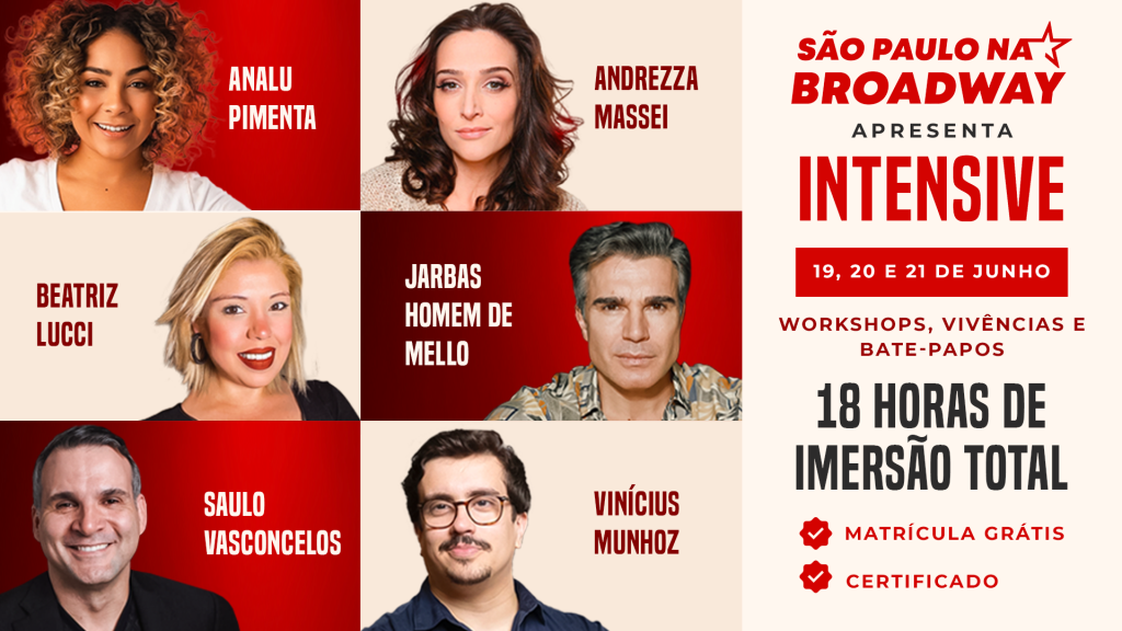 Com foco em desenvolvimento técnico e artístico, o Intensive contará com a participação de profissionais consagrados do teatro musical, entre eles Saulo Vasconcelos, Jarbas Homem de Mello, Andrezza Massei, Analu Pimenta, Vinicius Munhoz e Beatriz Lucci. As atividades abordarão temas centrais da prática cênica, como expressão corporal, construção de personagem, técnica vocal e os critérios buscados por grandes produções na seleção de talentos.