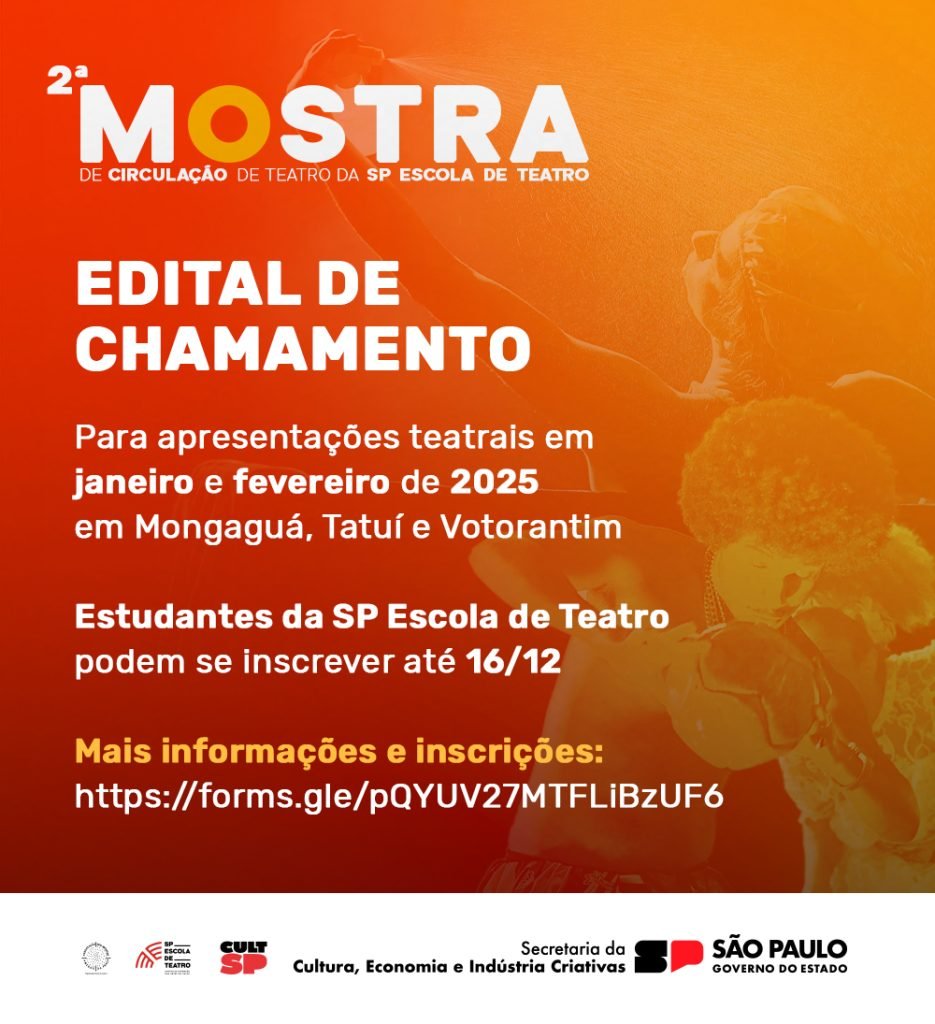 Entre 9 e 16 de dezembro de 2024, os estudantes regularmente matriculados nos cursos técnicos da SP Escola de Teatro – Centro de Formação das Artes do Palco poderão se inscrever no 2º Edital de Mostra de Circulação de Teatro da SP Escola de Teatro.