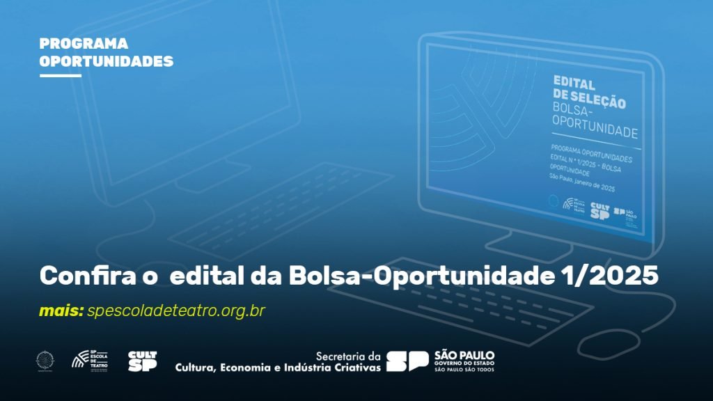 A SP Escola de Teatro – Centro de Formação das Artes do Palco lançou hoje (31) o edital de seleção da Bolsa-Oportunidade do primeiro semestre de 2025 para os estudantes da instituição regularmente matriculados nos cursos técnicos, ingressantes ou veteranos.