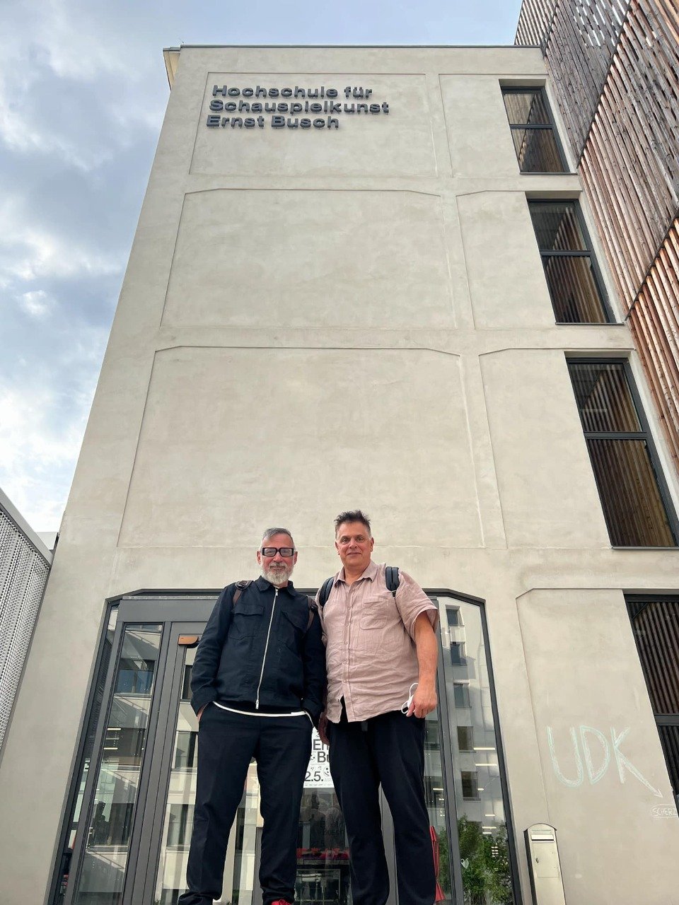 Ivam Cabral e Rodolfo García Vázquez em frente à Academia de Artes Dramáticas Ernst Busch, em Berlim